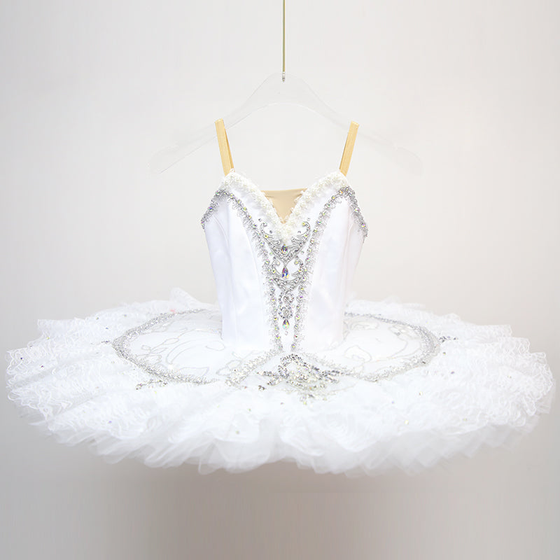 This professional white and silver tutu has been created for roles like Clara (Macha) in Nutcracker but is also suitable for Snow Queen, Snow Corps, Sleeping Beauty and many other classical variations. The bodice features a deep V in the front with a nude insert and elastic straps. The decoration of the bodice uses silver trims and appliques, beads and crystals. The ten  layers of the professional skirt are all tacked together so that the costume moves as one with the dancer. The skirt features a rich decoration pattern made of silver trims, lace, sequins and crystals.