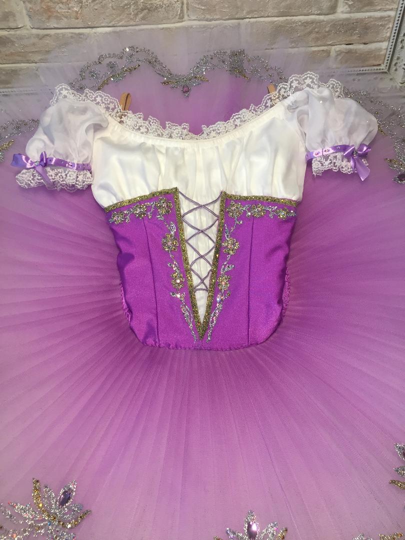 This professional tutu features a a peasant bodice that fastens in the back with hooks and eyes. The top part of the bodice is white, featuring a round neck, ad short sleeves decorated with white lace and lilac ribbons. The lower part of the bodice is made with elasticated lilac/orchid fabric, a laced pattern in the front, gold and silver trims.