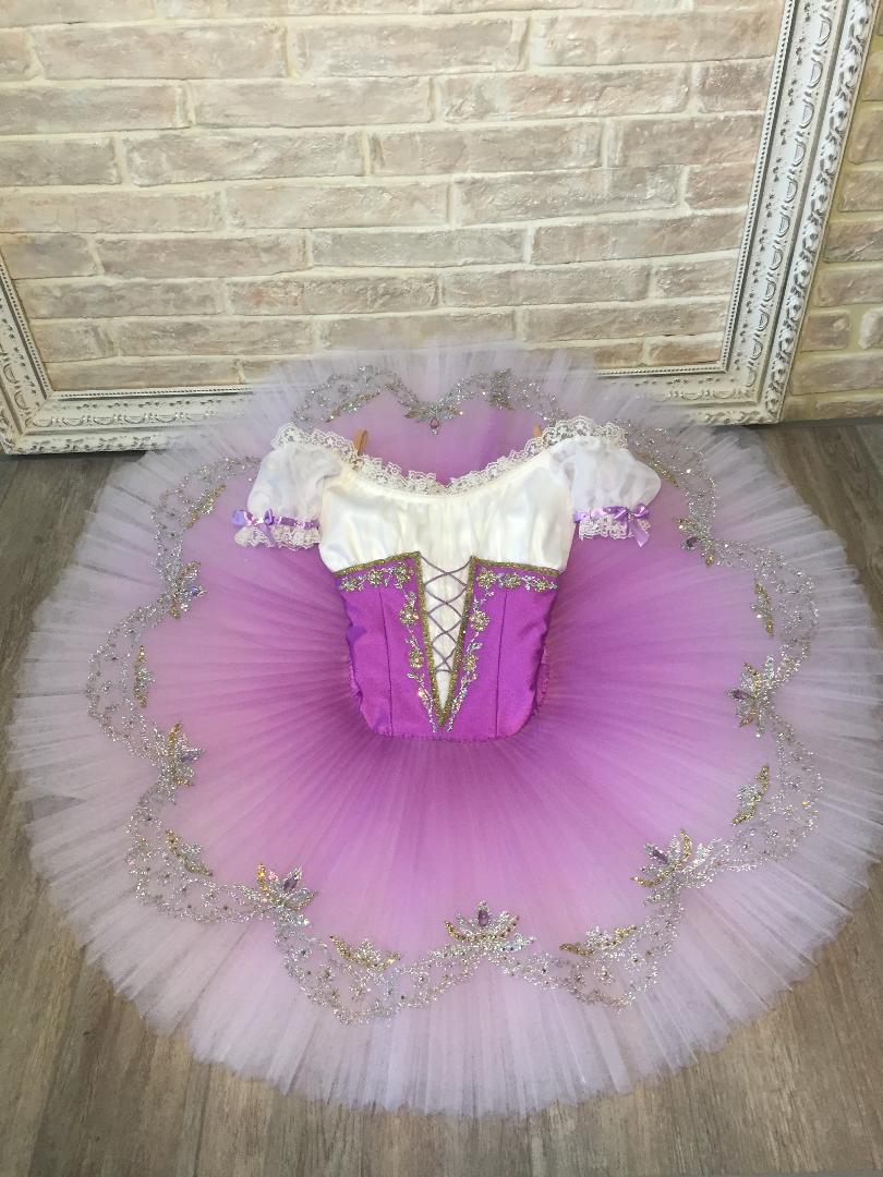 The professional, 10 layers tutu skirts features gradient tones of lilac, and rich gold and silver decoration, near the edges of the tutu skirt.
