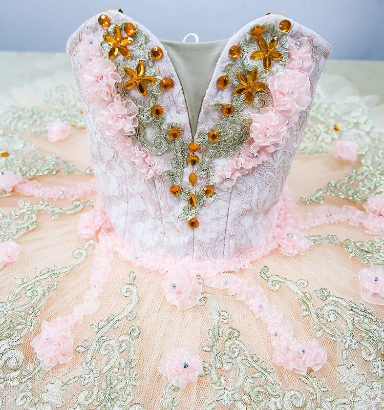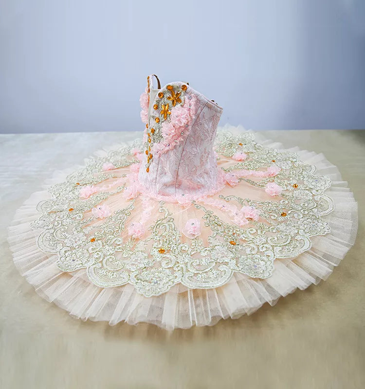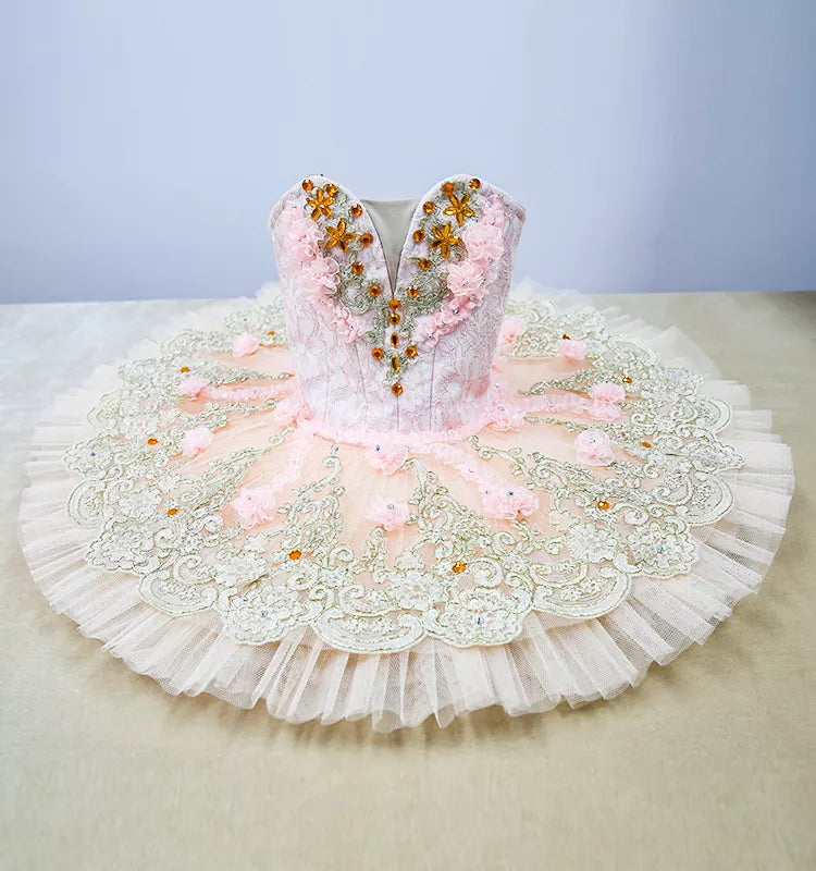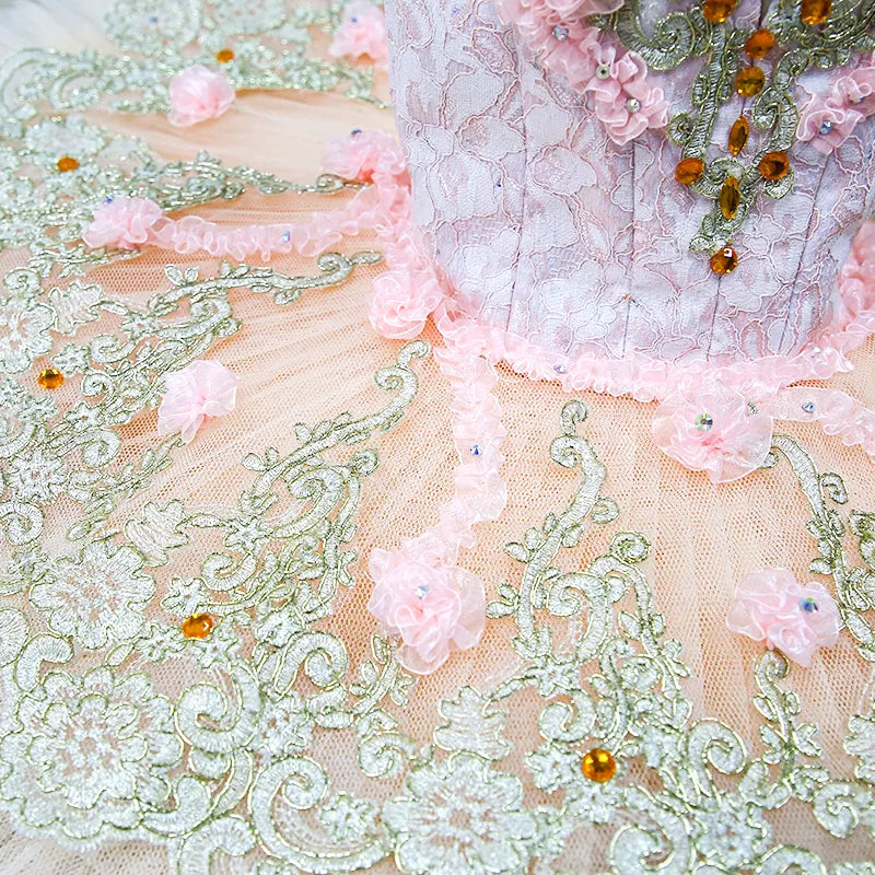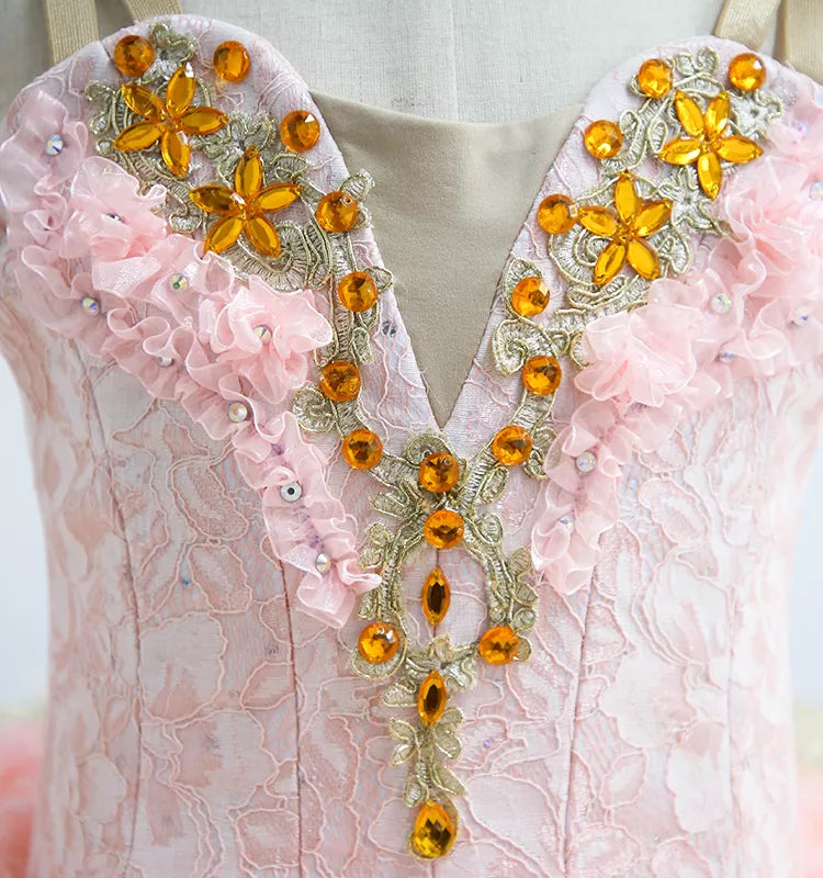 Pink brocade bodice with rich floral decoration and crystals. The tutu skirt features an overlay made of ivory lace, crystals and brocade inserts,