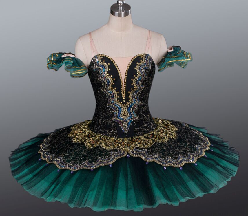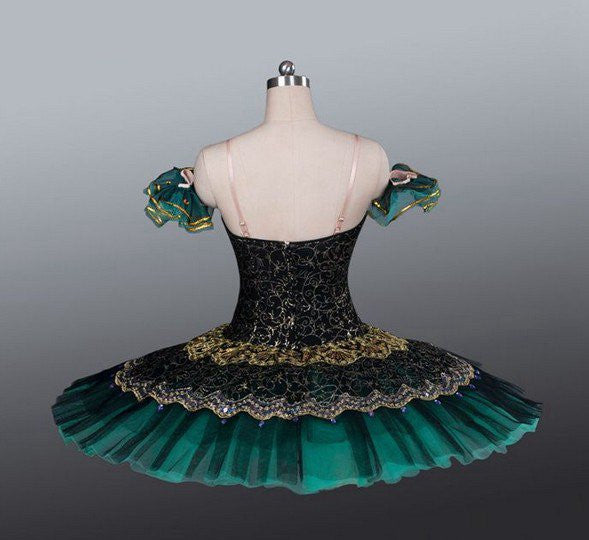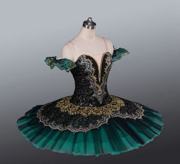 This stunning deep green professional tutu has been created for the role of Esmeralda. The combination of dark and light green, gold and black, make this stage costume a unique one.