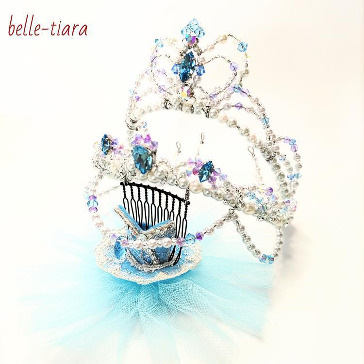 This crown-type tiara is inspired by Florina and uses silver pearls and blue Swarovski crystals. The base color can be changed to white or gold, and the color of the Swarovski crystals and crystals can be changed.