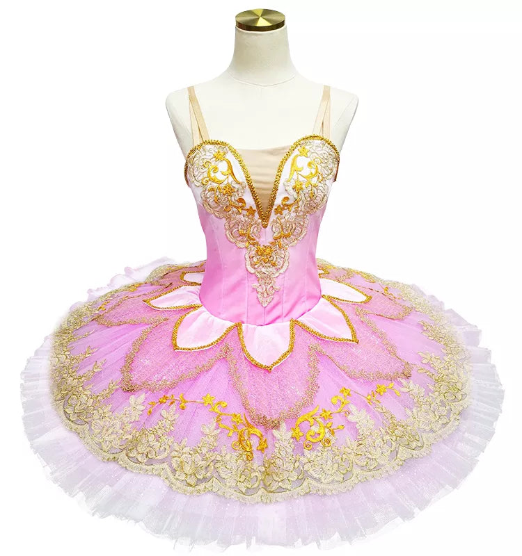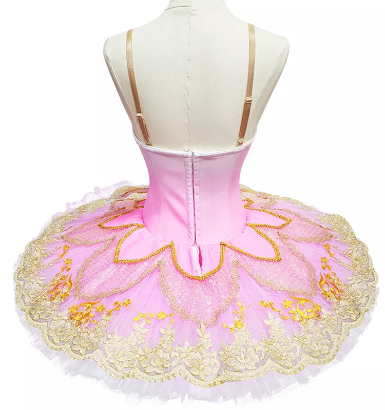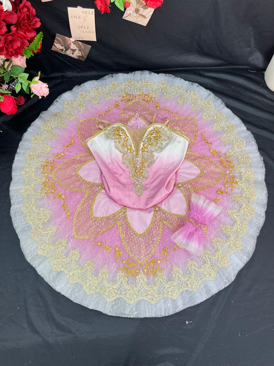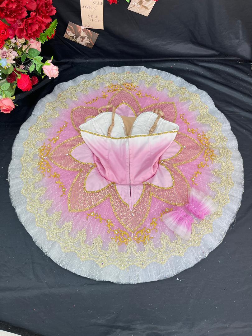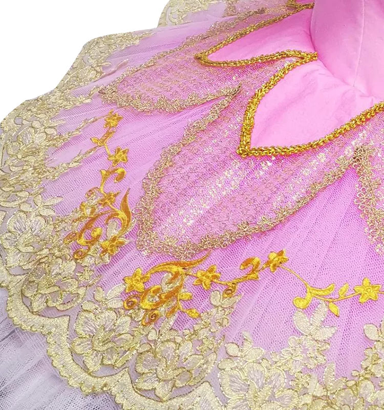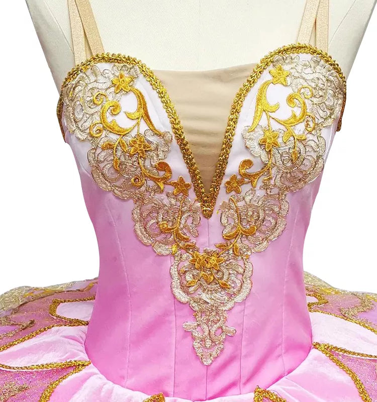 The bodice is made with hot pink stretchy fabric, and features rich embellishments made with golden trims and appliques. The V-shaped nude insert in the bodice is very deep, making the ballerina's body look long and slender. The bell shaped tutu skirt is created with white and pale pink tulle, and features, embellished with golden trims, lace, glittery tulle, appliques and sparkles.