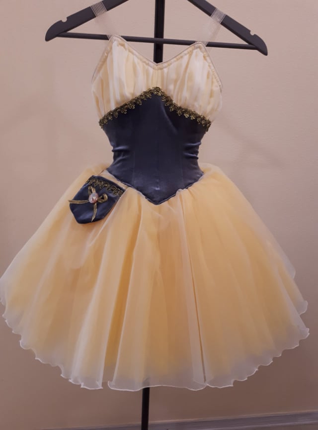 This professional, Russian made tutu, featuring tones of cream and pale yellow, combined with black, is one of our most outstanding creations! Suitable for the ballet "Esmeralda", especially for the tambourine variation.