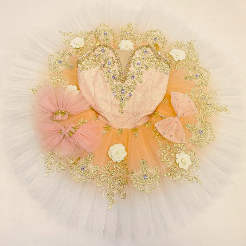 The professional tutu skirt features the ombre color, starting with a beautiful shade of pale peach color, and fading to white. There are embellishments made with white flowers, pink sparkles, gold trims and appliques.