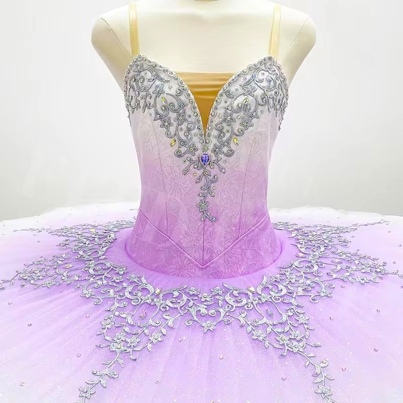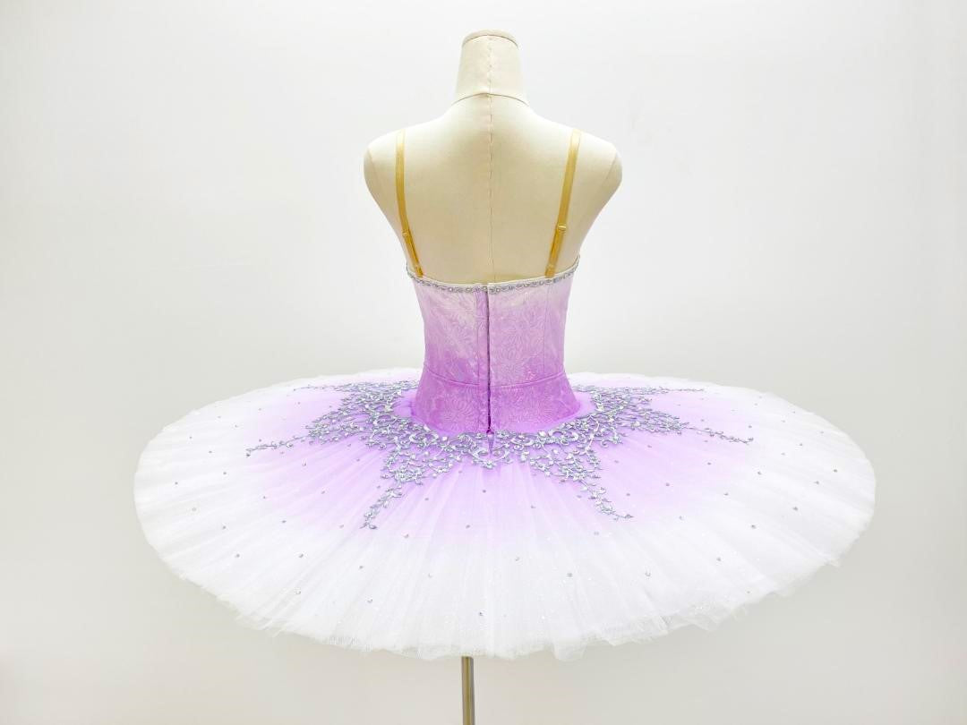 The professional, 12 layers platter skirt is entirely pleated, and is also ombre; dyed in fading shades of lilac, and decorated with silver appliques and trims that start from the tutu basque and reach the edges of the tutu.