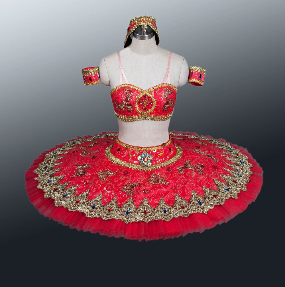 The 10 layers platter tulle skirt features a red and gold overlay with lavish embellishments, red and gold appliques, diamonds, red sequins, blue and red stones. The tutu basque is also richly decorated in gold and shiny red.