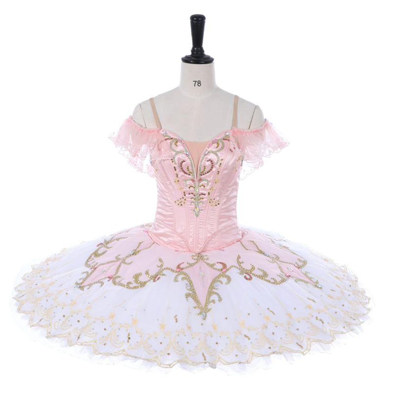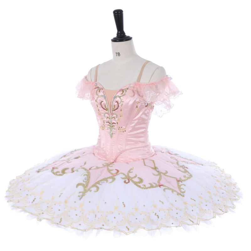The bodice of this professional stage costume is entirely created with pink satin fabric. It features a deep V in the front with a nude inset. Decoration was made using the highest quality golden trims, pink and silver decorations. Nude straps and pink lace arm bands included. The bodice fastens at the back with two rows of hooks and eyes. An elastic string is sewn into the top part of the bodice to assure a perfect fit. Hooks and eyes closure in the back. The pink ten layers professional pancake skirt features a pink and lavender overlay made with different types of lace, gold appliques and beads.