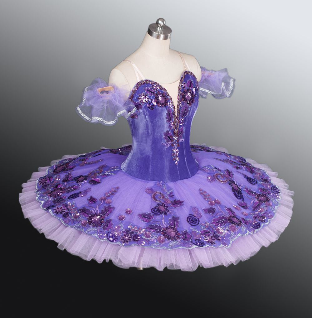 The professional platter skirt is made using high quality light purple tulle and features a darker lilac overlay. Decorations were made using the same purple sequin appliques as the bodice, sparkles, sequins and crystals. This costume is extremely shiny on stage and caters for the most sophisticated ballerinas and highly professional performances.
