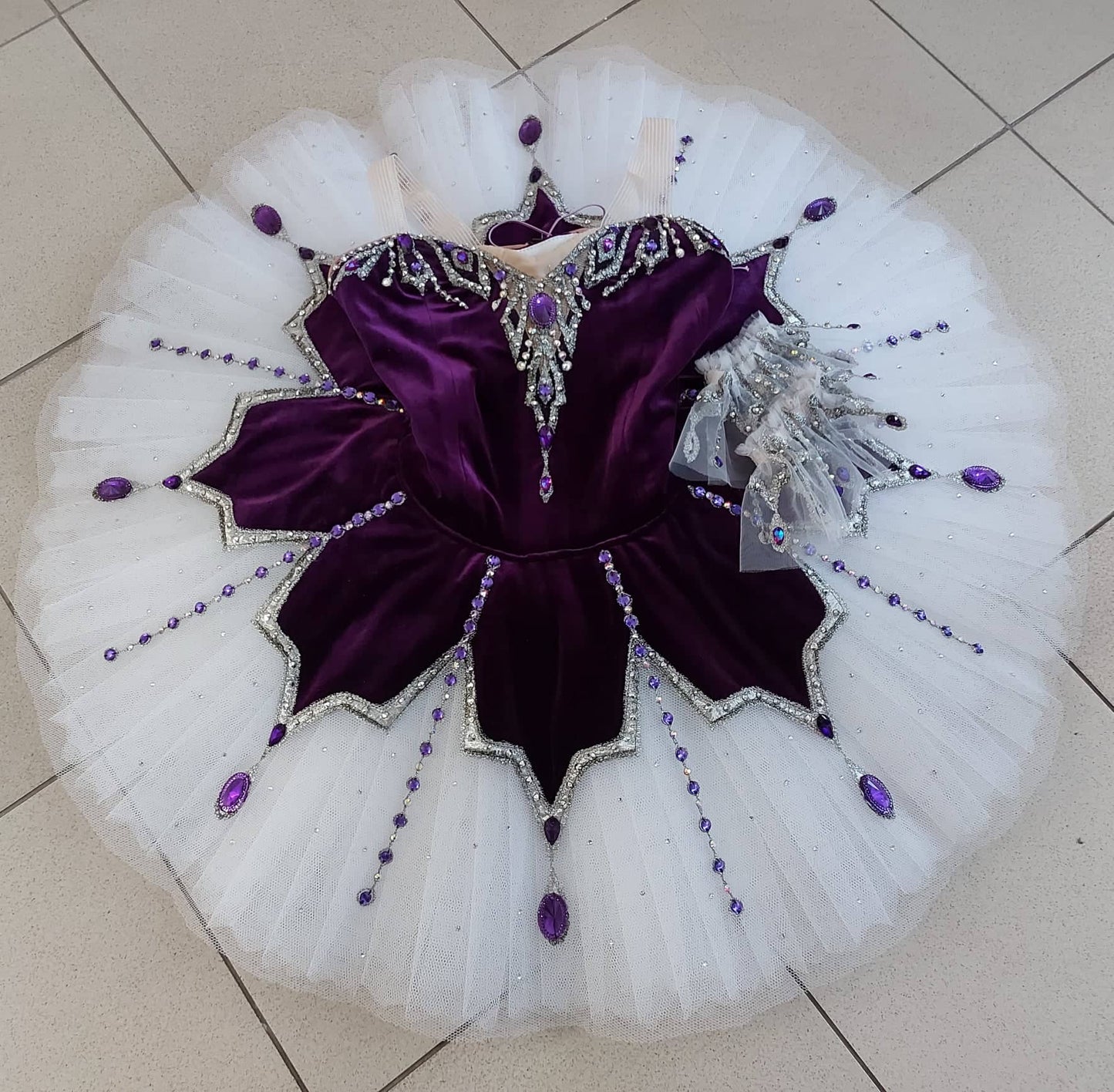 Professional, 10 layers white tutu skirt decorated with purple stones and silver trims. Hoop inserted, ruffled panties.