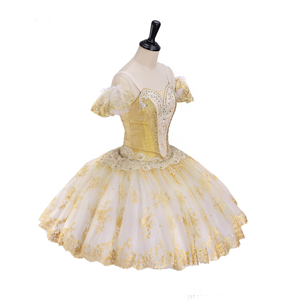 The bodice of this tutu has been created using a special, semi-stretchy and shiny, golden fabric. The color is a warm shade of gold. There is a deep, white V insert in the front, richly decorated with appliques and crystals, as well as a nude insert. Decorations of the bodice were made using ivory and golden trims, golden beads, crystals and sparkles. The bodice fastens at the back with a double row of hooks and eyes. An elasticated string in the upper part of the bodice assures a perfect fit. White and gold arm bands are included. Nude thin straps.