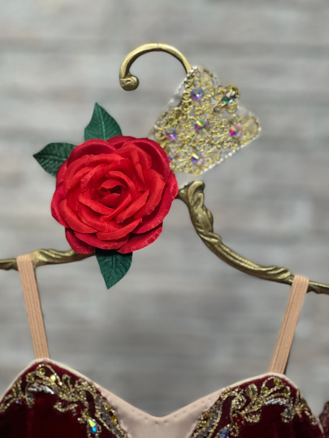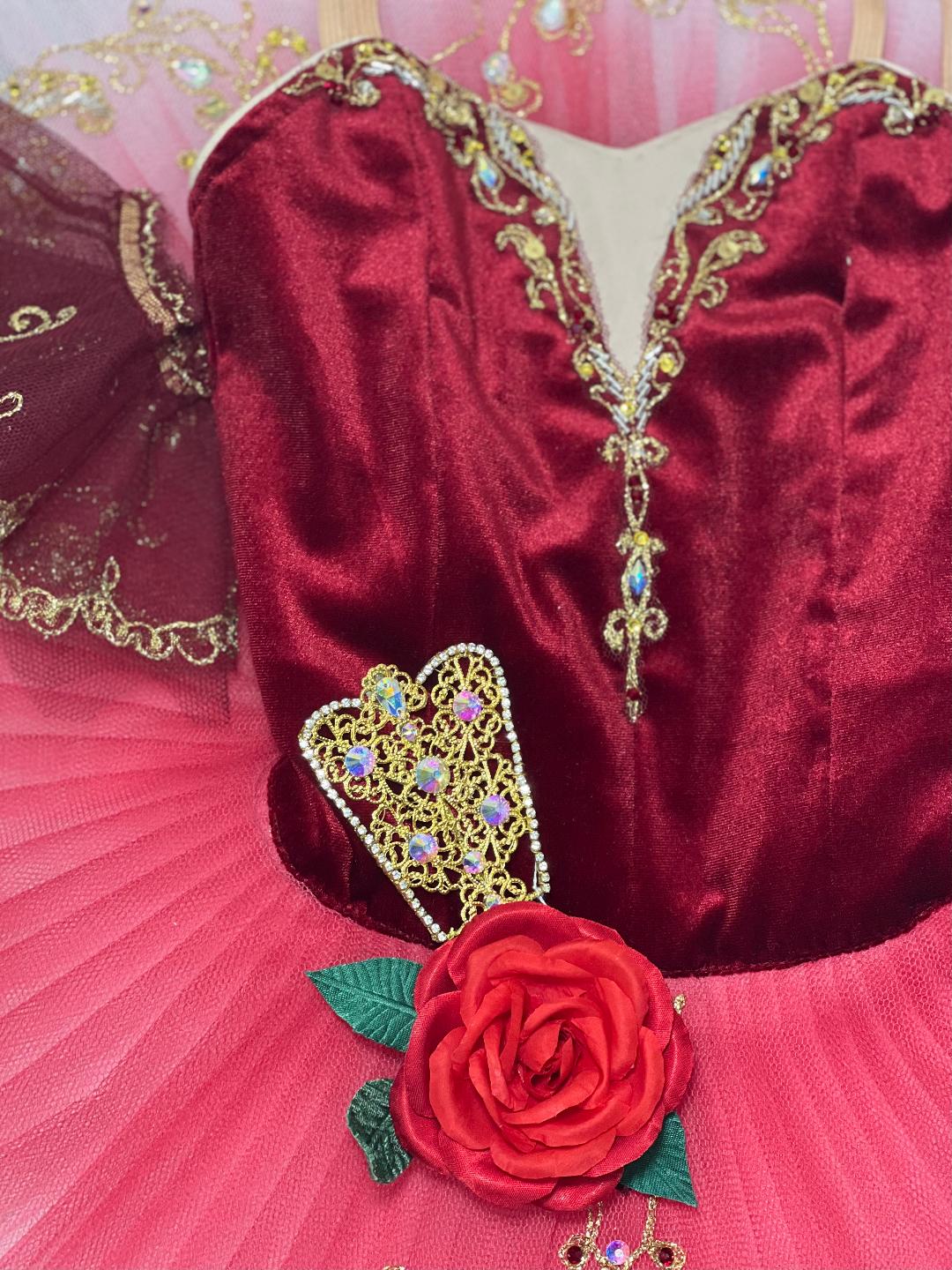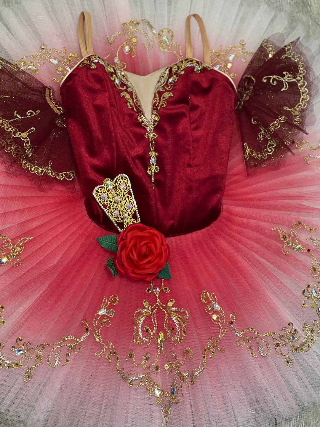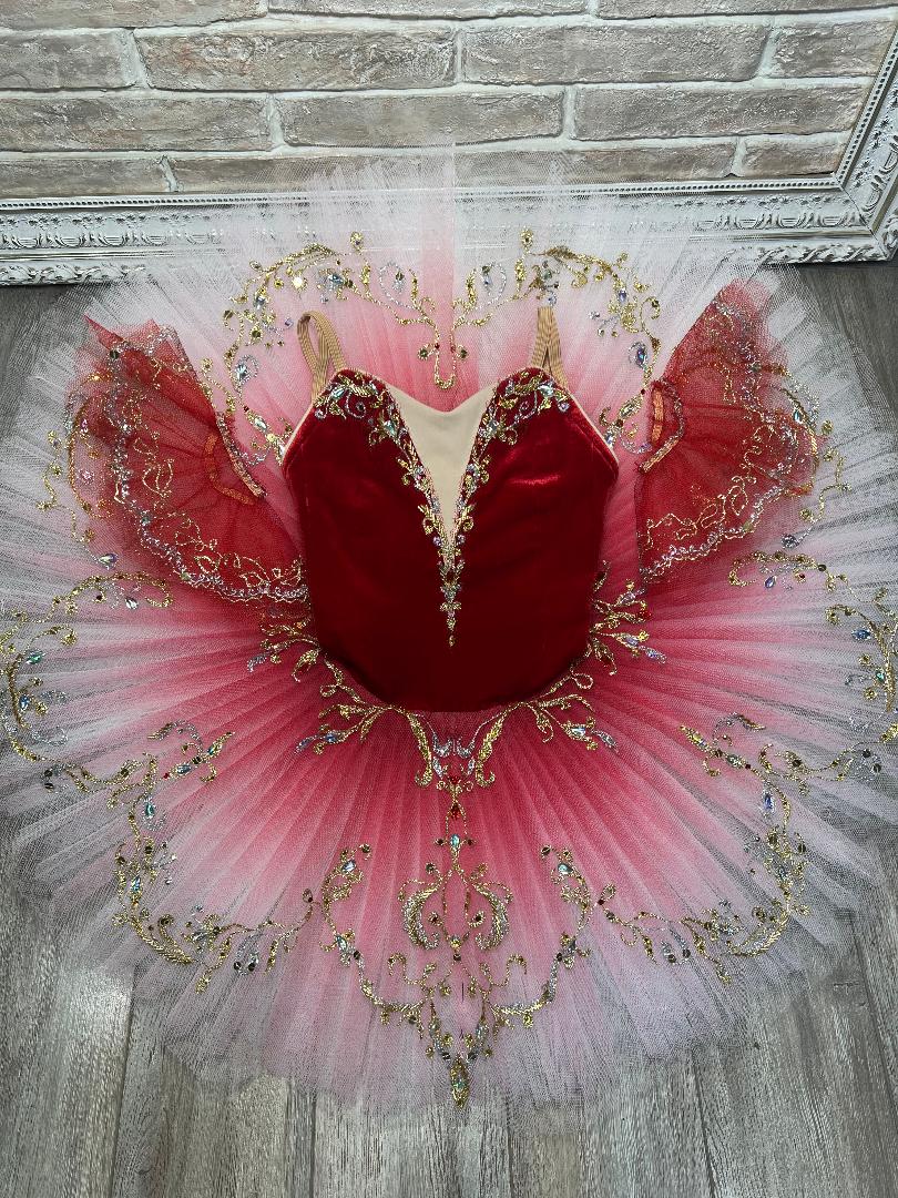 The bodice is made with dark cherry red velvet, and decorated with gold shiny appliques. Deep nude insert. The professional, bell-shaped tutu skirt features the amazing ombre' technique. It  is made with the finest tulle, and shows gradient shades of cherry color, fading to white. It is decorated with rich gold appliques.