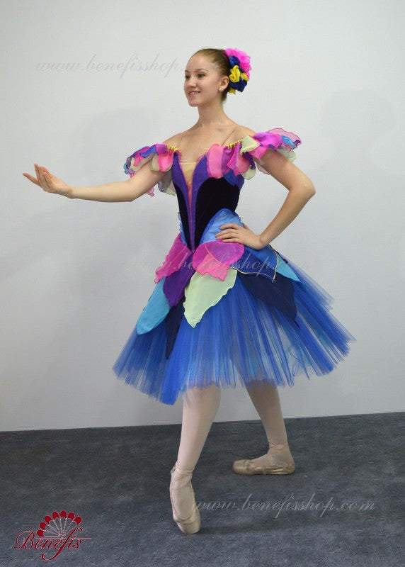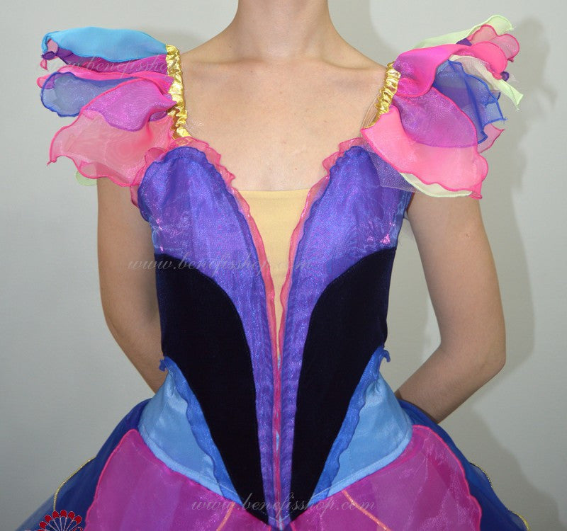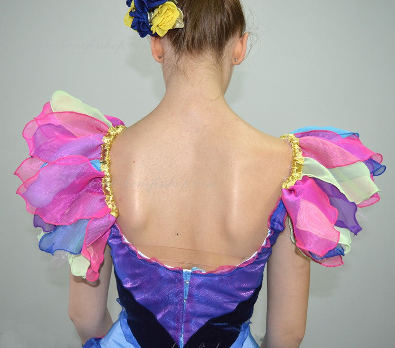 The bodice is made of semi-stretched dense fabric, with decorative elements from organza and velvet of different colors.