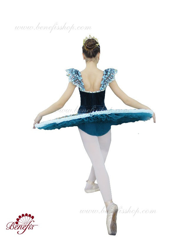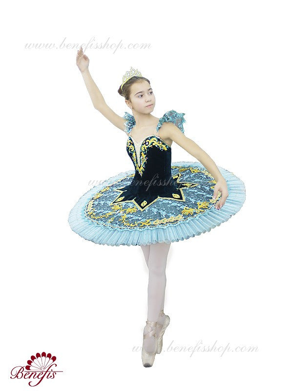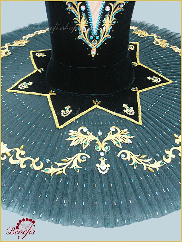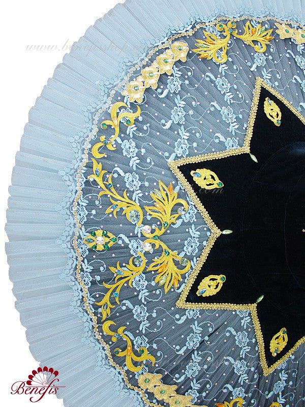 The upper layer of the tutu skirt is embroidered with bugles; a pair of arm puffs decorated with braid comes along with the costume. The costume can be carried out in any color if the customer wishes