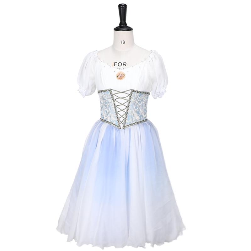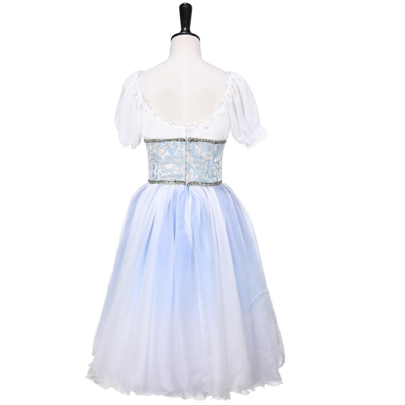 A wonderful Romantic peasant tutu for multiple roles. The bodice, with a pretty crossed pattern, is made with pale blue brocade, and features a white undershirt with short sleeves.