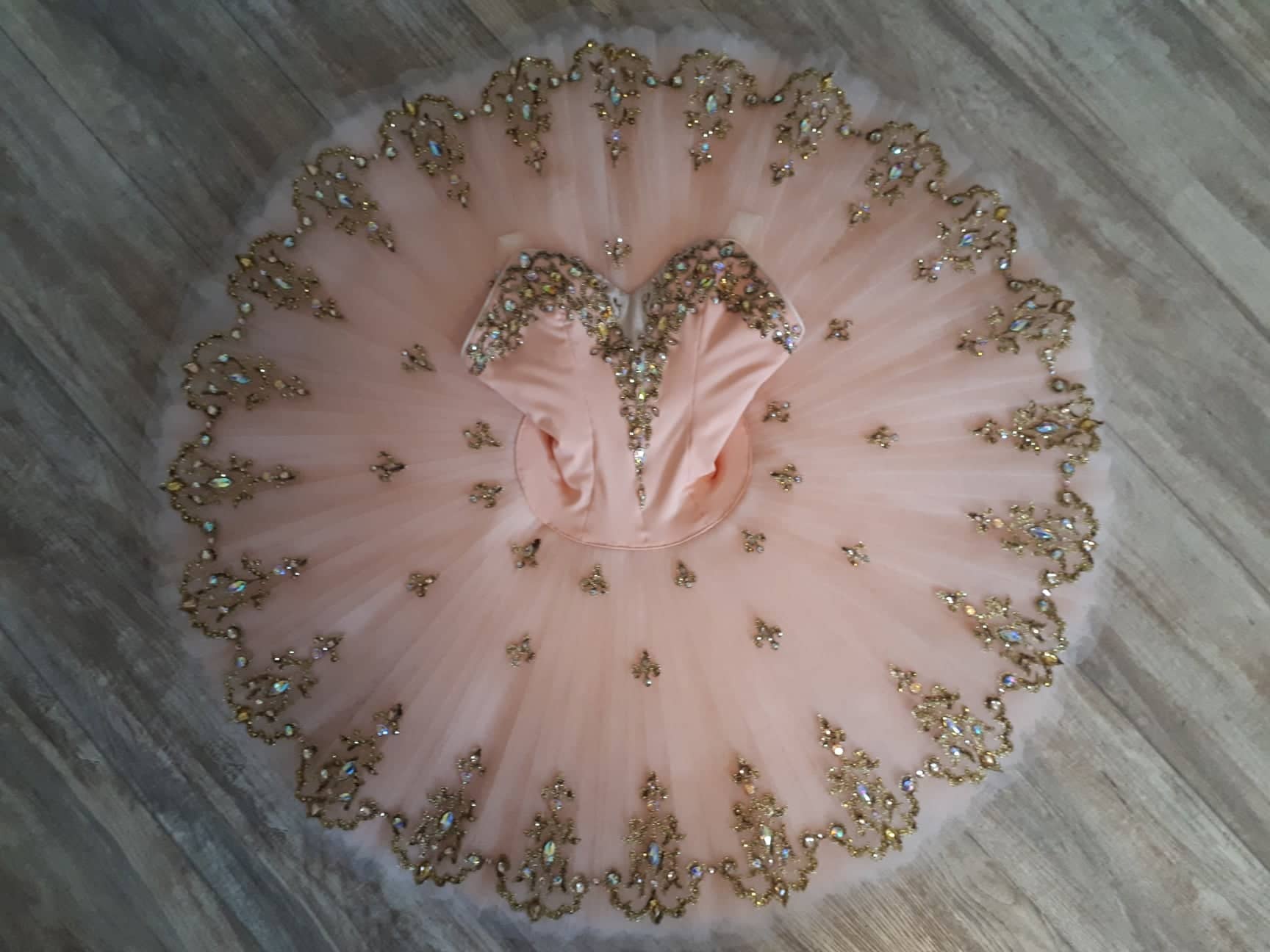 The pancake tutu skirt is a masterpiece. The tutu skirt features 10 layers of white net, except for the top layer, which matches the color of the bodice. The rest of the skirt is covered all around in gold appliques, stones, golden trims, and crystals.