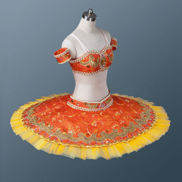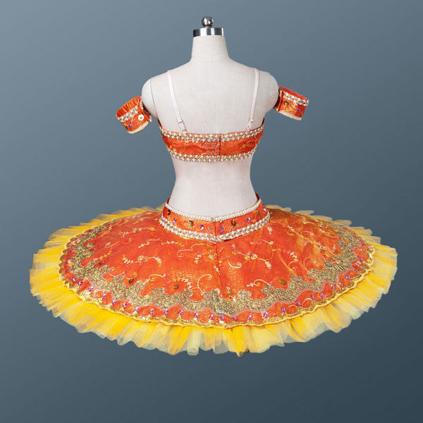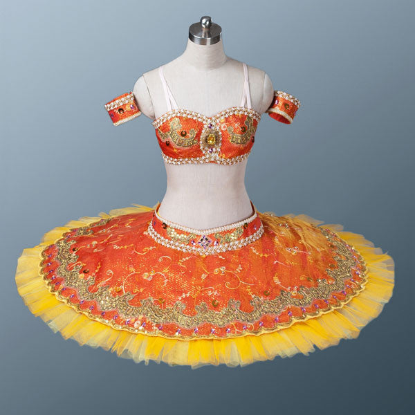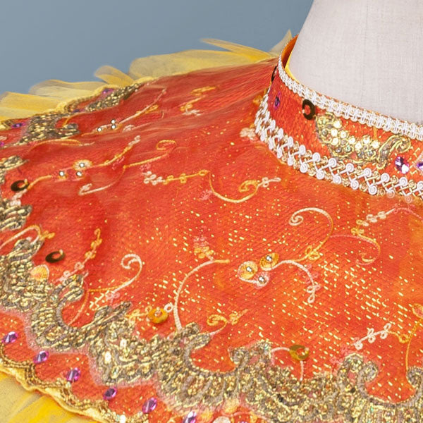 The professional, 10 layers platter skirt is also orange and features an organza overlay richly decorated with all sort of gold embellishments, trims, stones and crystals.