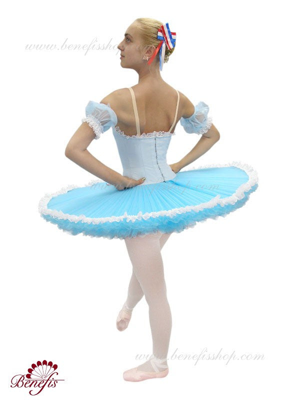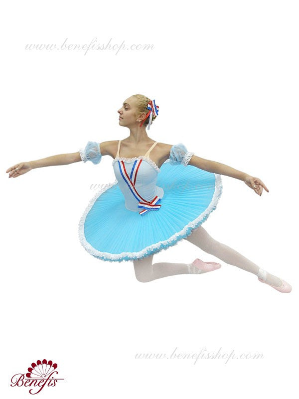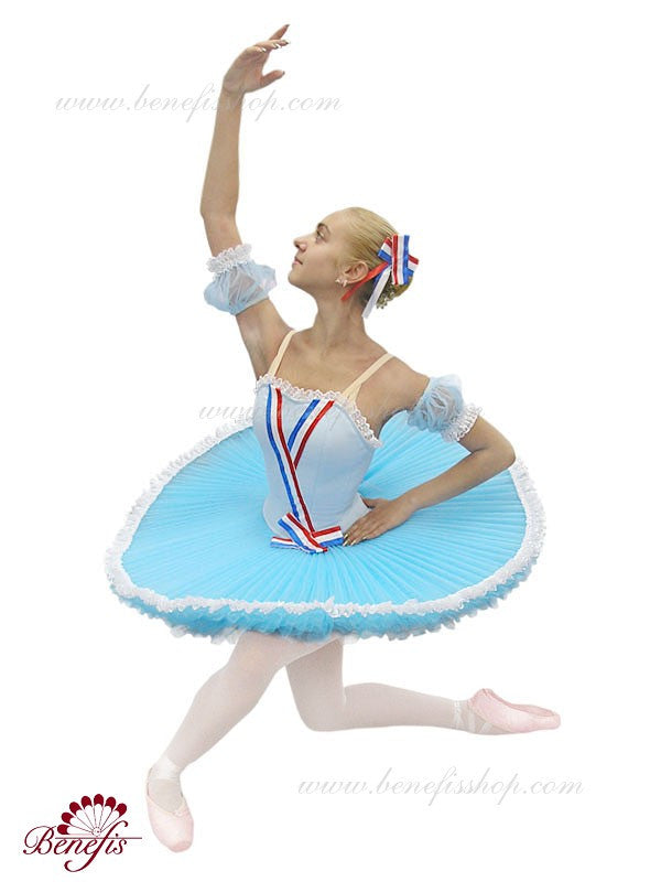The costume’s style – highlighted with the help of three-colored tape, which symbolizes the French flag – is characteristic for the “Flame of Paris” ballet.