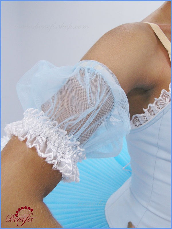 The skirt, the bodice and the sleeves are trimmed with white gentle lace.