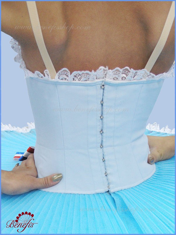 The bodice has two rows of hooks for the comfortable adjustment and an inner cord to tighten the bodice at the chest level.