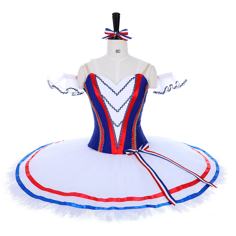 This tutu is created in the traditional French style that suits this ballet. The bodice of the tutu features a sky blue and red corset with a white insert decorated with blue trims.