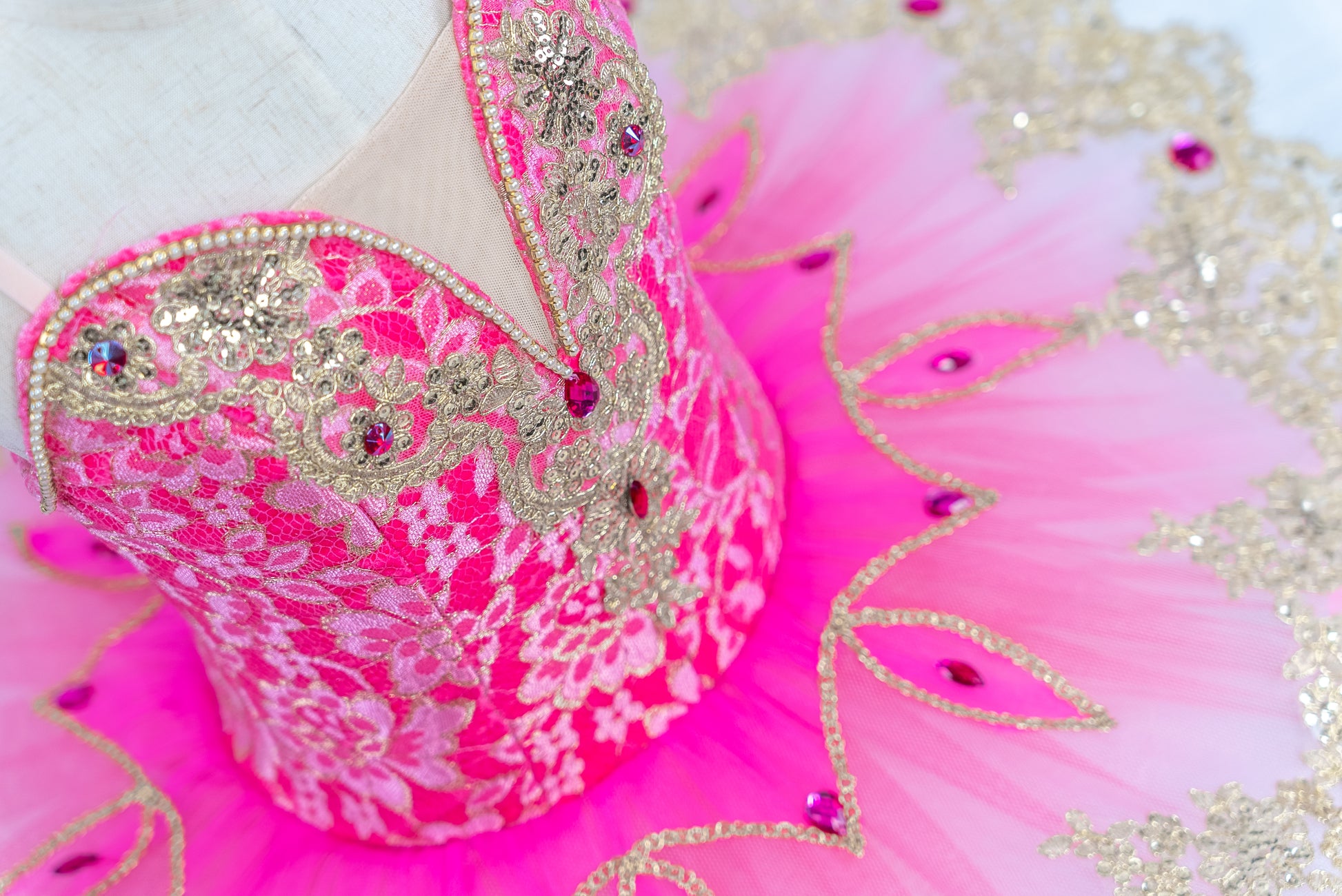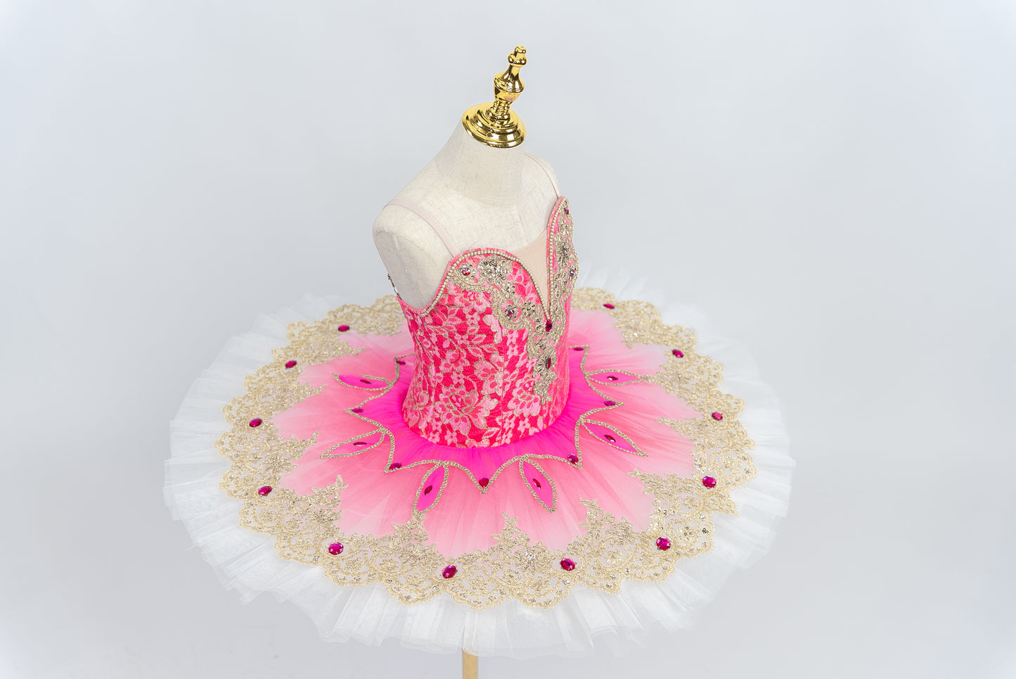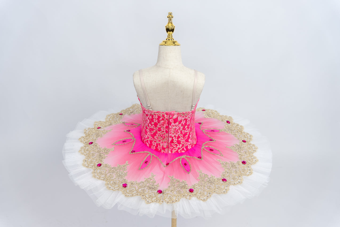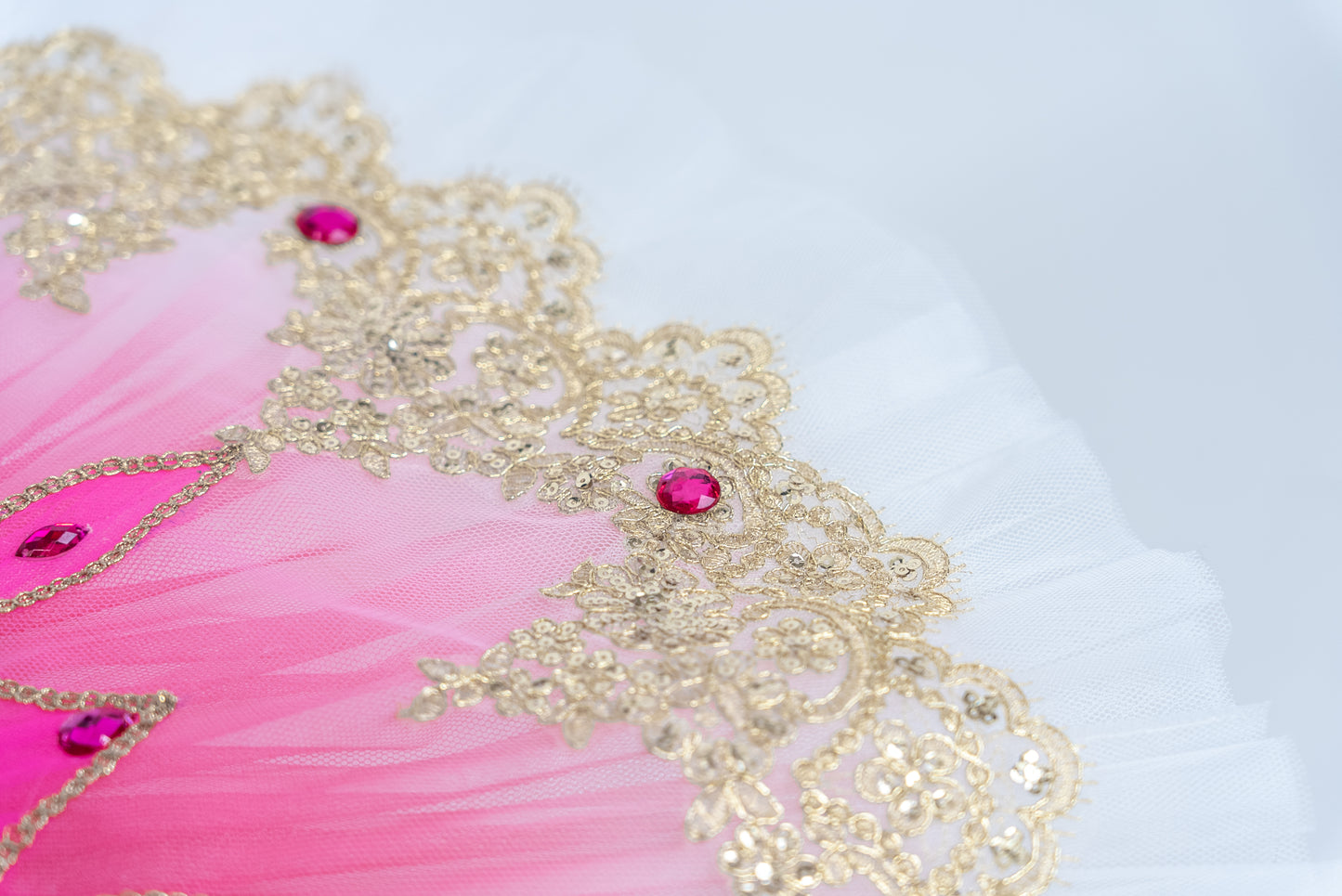 The professional, pancake tutu skirt has been ombre' dyed in gradient shades of pink. The tutu skirt is entirely decorated with pale gold appliques, golden trims and hot pink crystals.
