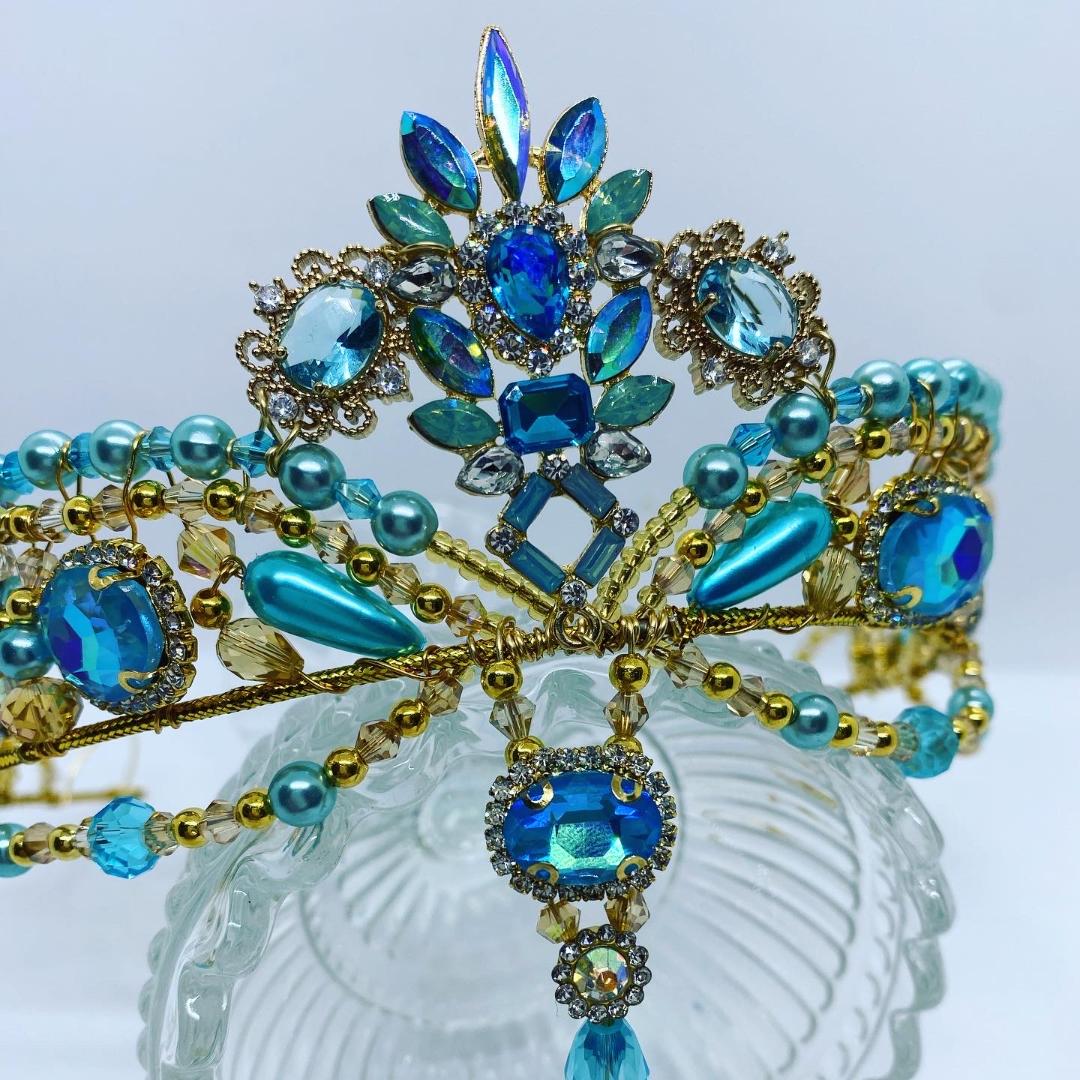 This czarina type tiara is built on a golden frame (upon demand it can be made with silver frame), and features blue crystals in different sizes and shades of blue, as well as blue and gold pearls.