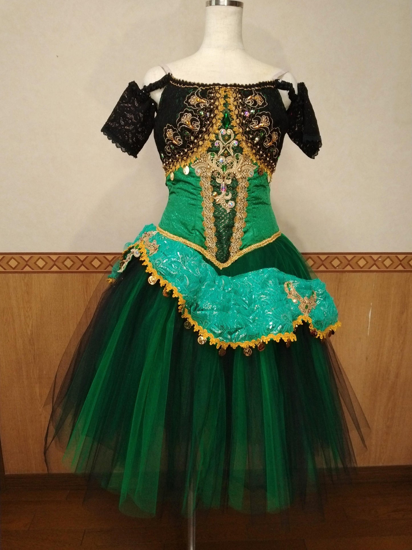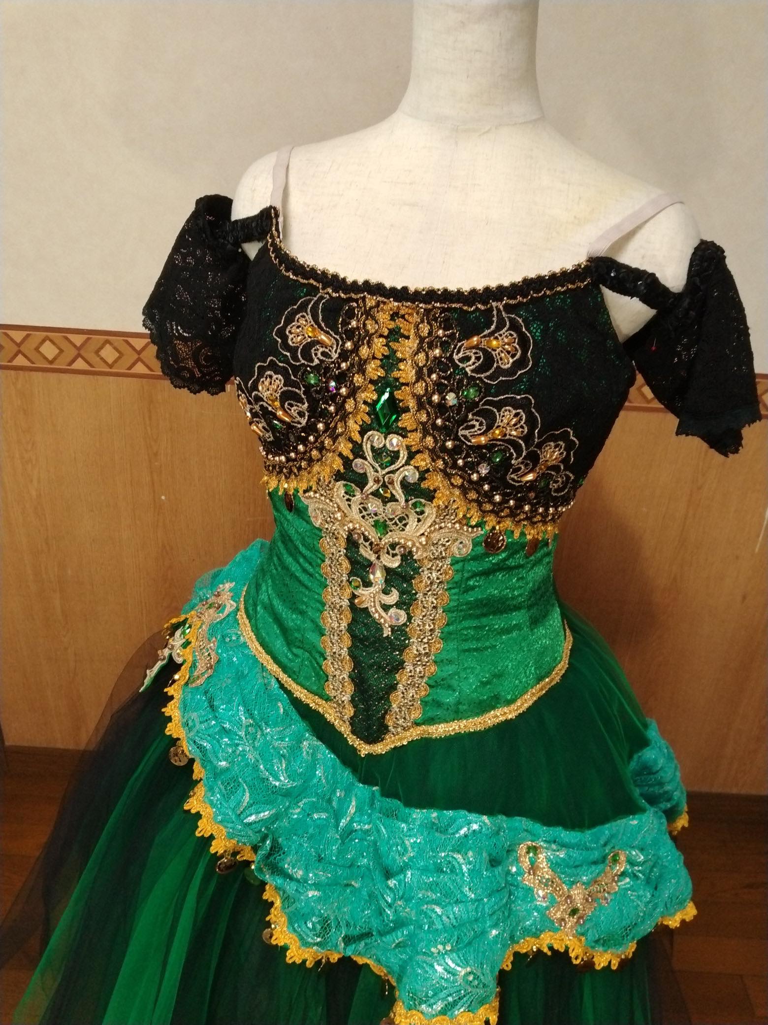 An amazing, Japanese professional Romantic tutu for the role of Esmeralda. This Romantic professional tutu features various shades of green and black accents.