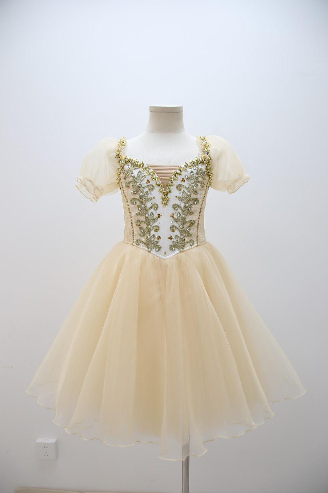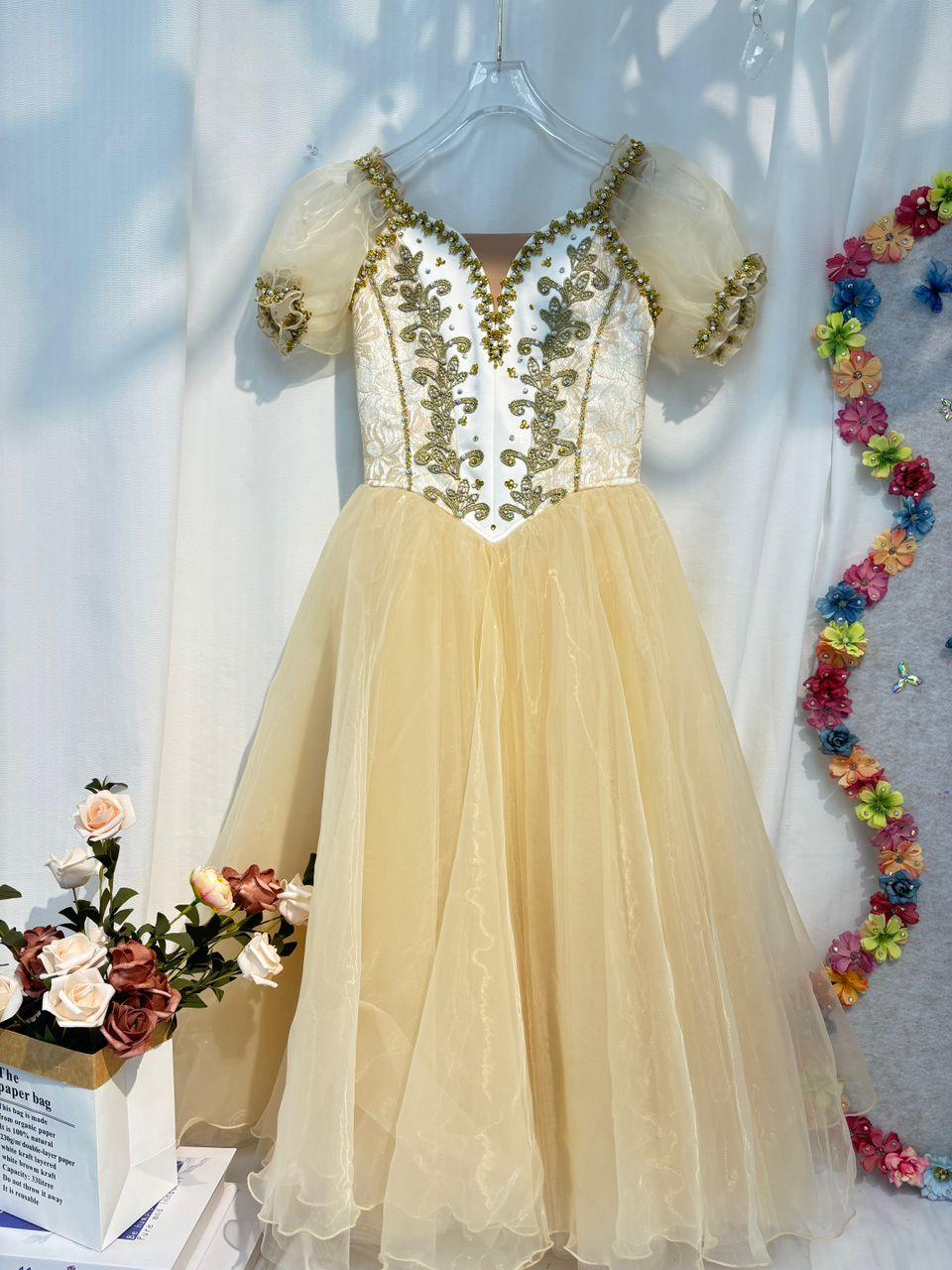 The bodice is made in peach semi stretchy and feature a delightful gold decoration and pale pink net sleeves.