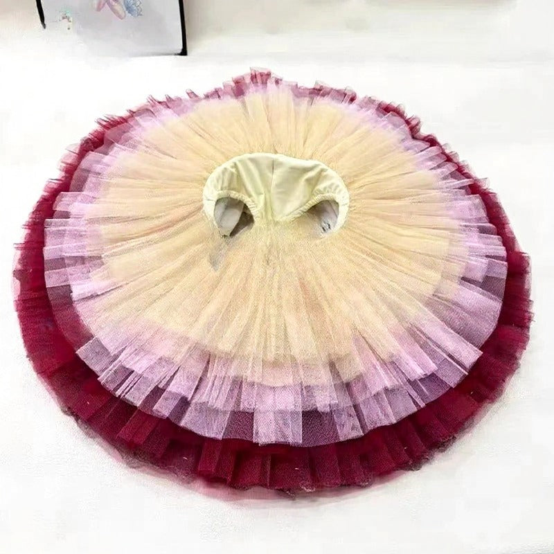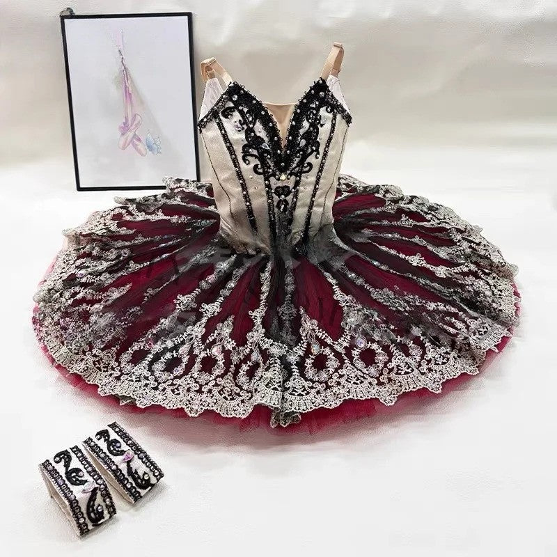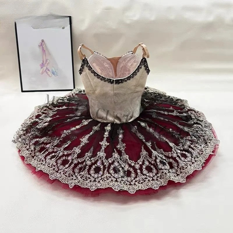 The professional, twelve layers tutu skirt is deep red, and features the richest decoration and a Spanish looking pattern. Gold appliques and lace decorates the entire tutu skirt, making the look of this stage costume absolutely stunning.