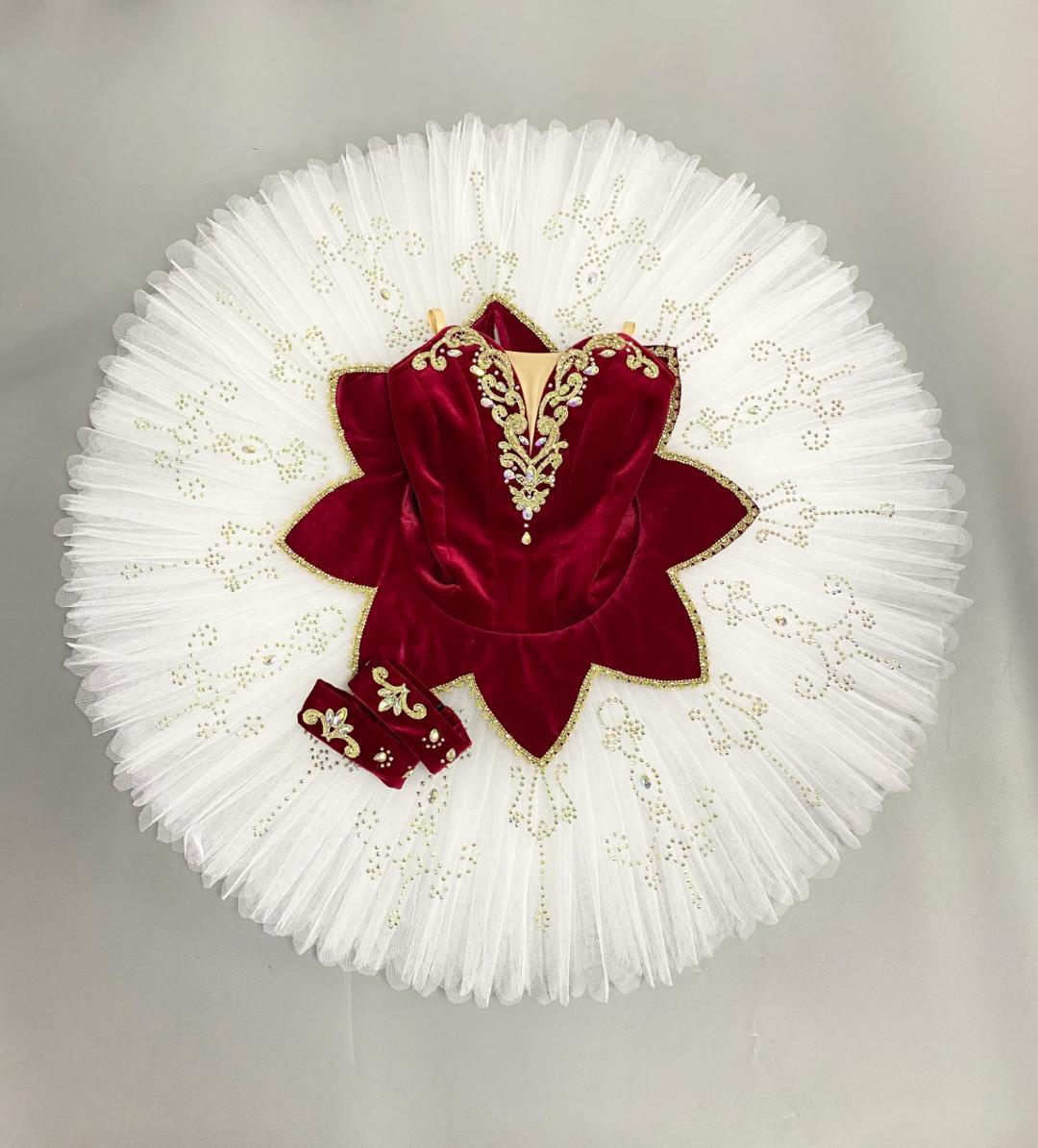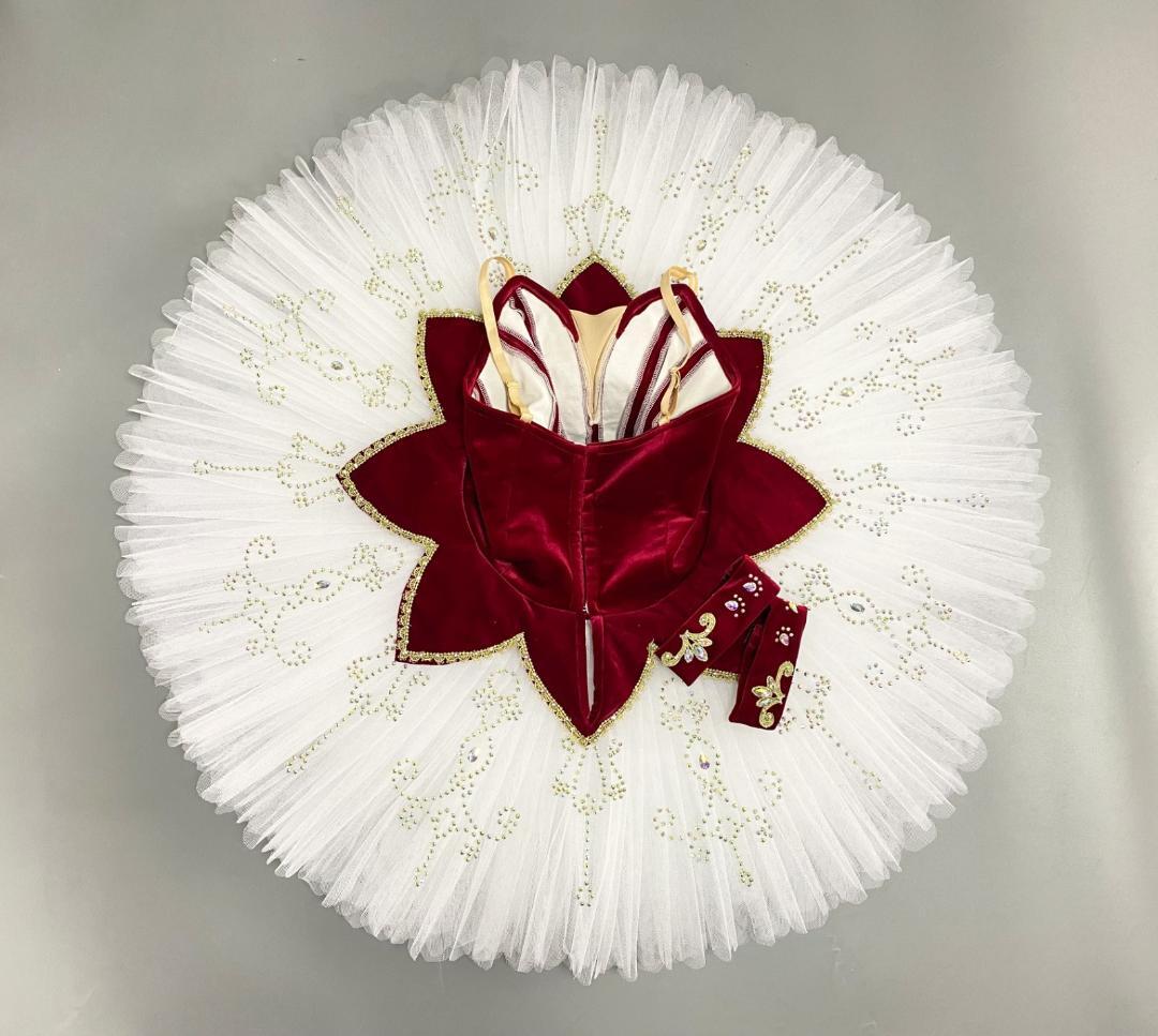 The tutu, professional 10 layers skirt is made with white French net and features a flower shaped tutu skirt, made with the same deep velvet used for the bodice.