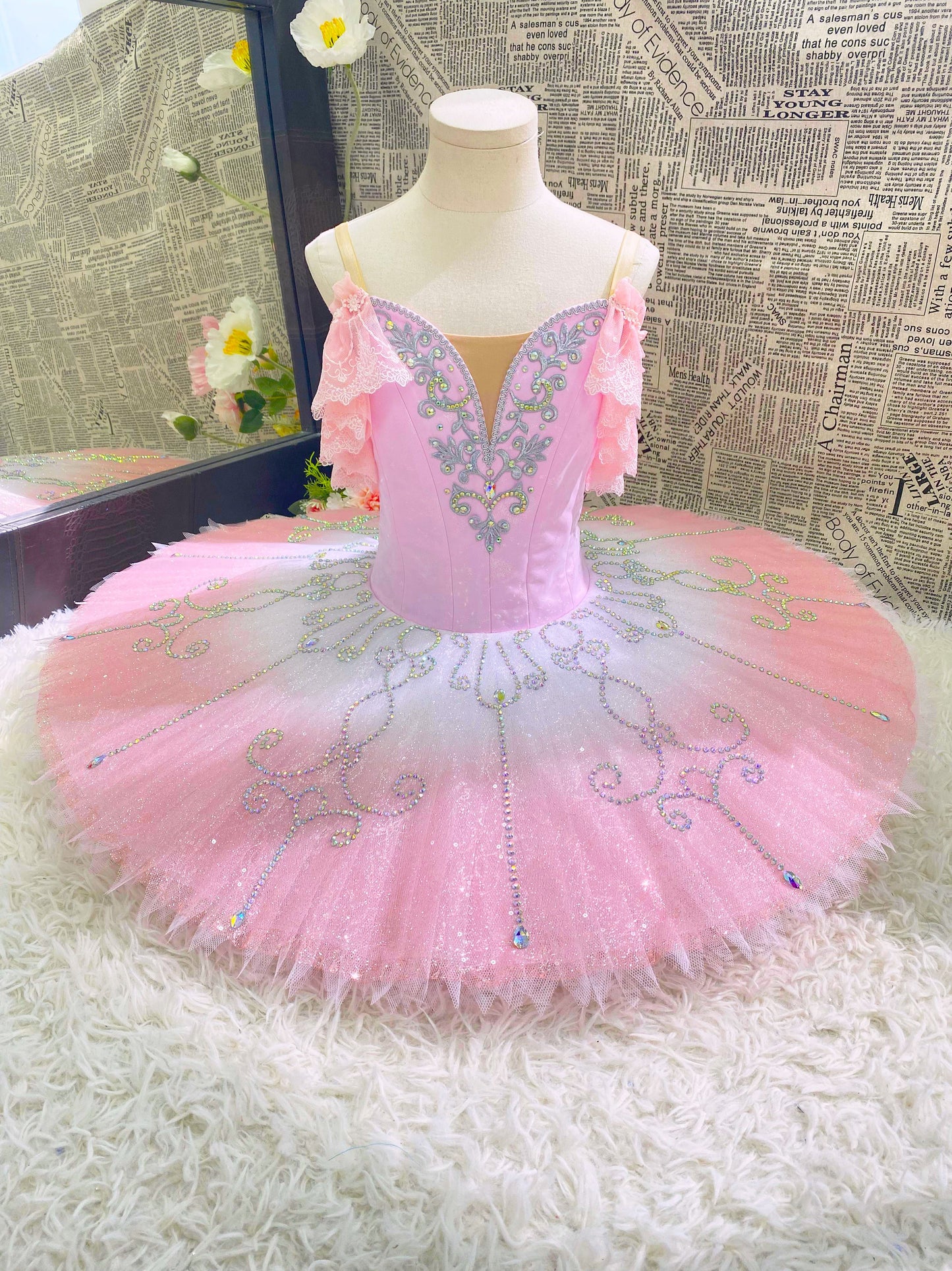 The 12 layers, professional tutu skirt has been ombre' dyed, featuring gradient shades of pink, fading to white. The tutu skirt is also decorated with silver appliques and crystals, and with a glittery top layer.