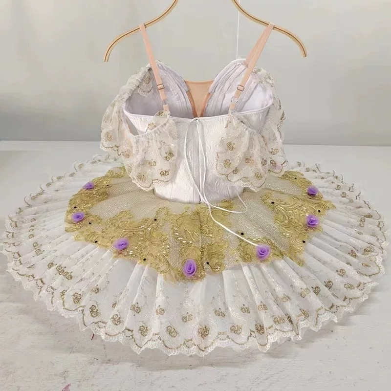 Gold net tutu skirt, decorated with golden appliques, small lilac flowers, and a big lilac rose on one side.