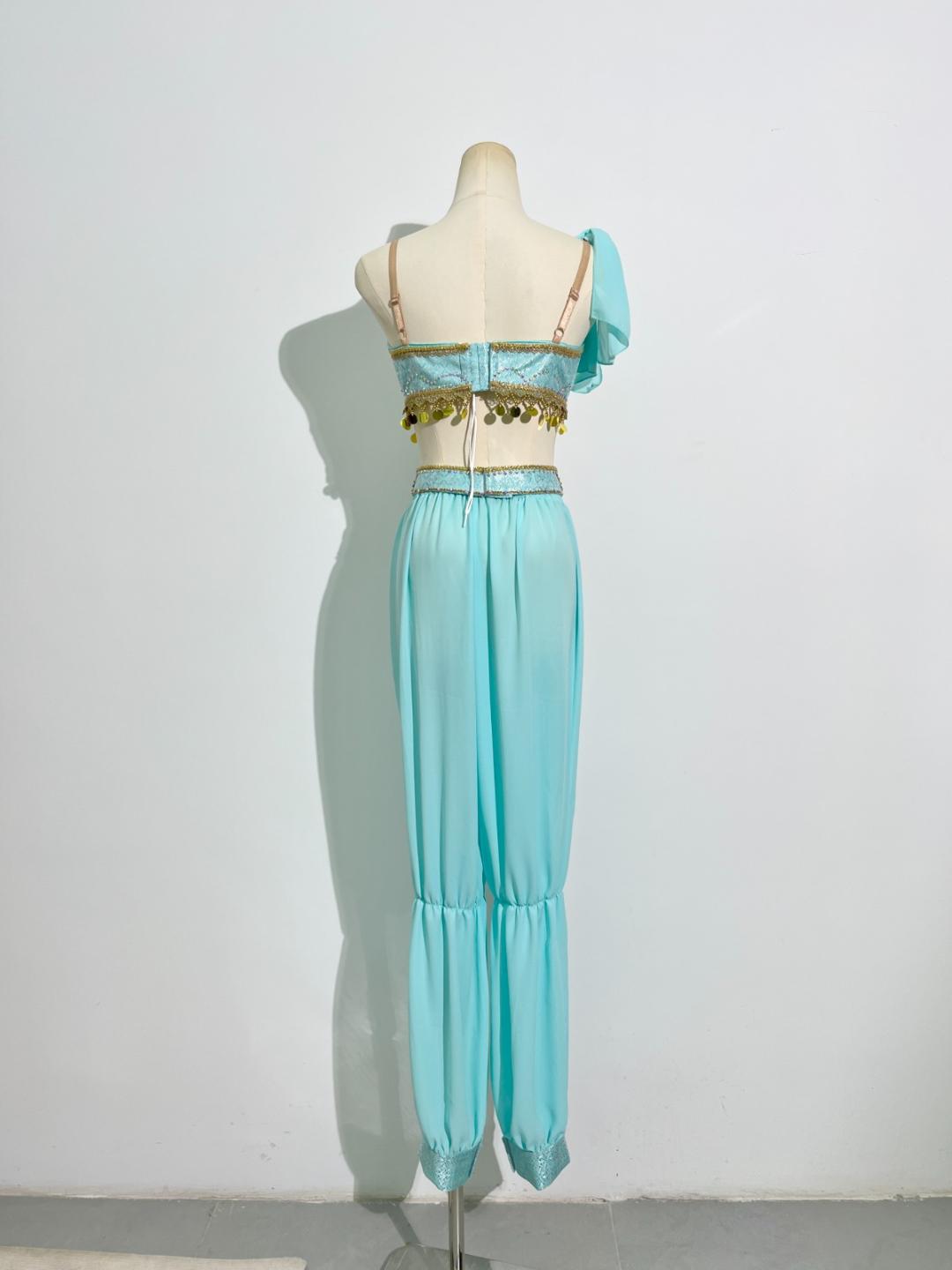 This professional ballet costume consists in a short top made of aqua green brocade and chiffon matching aqua green pants. The top is decorated with gold trims and coins, as well as with crystals and gold appliques.