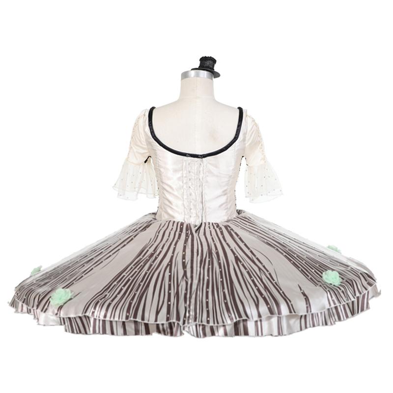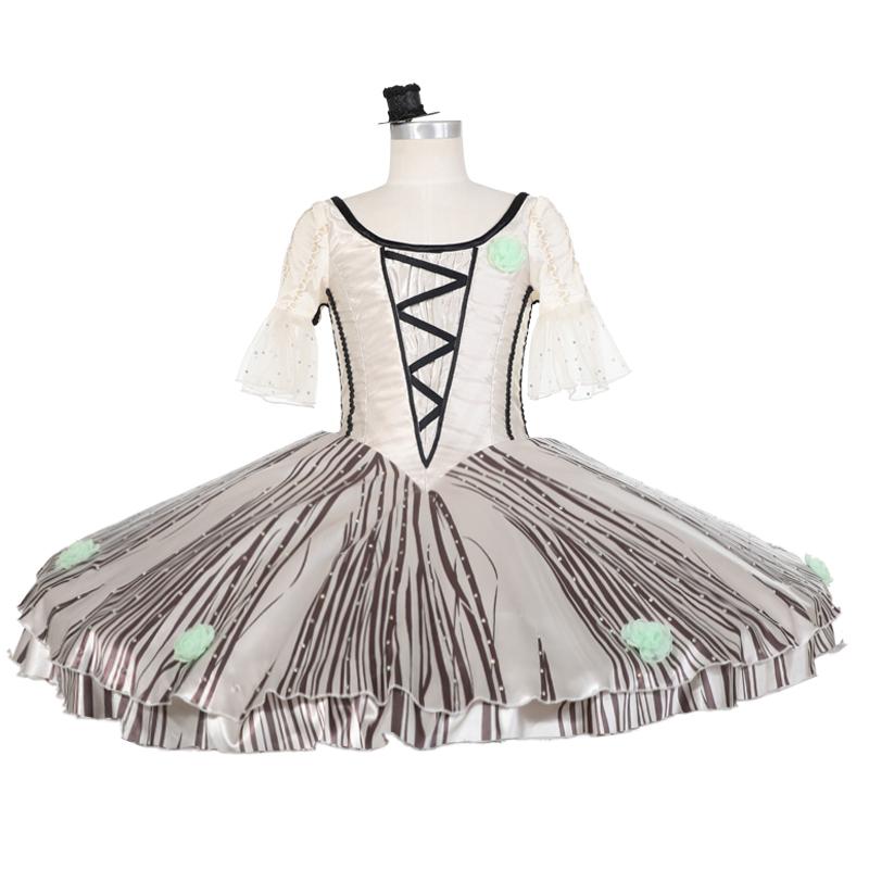 Satin ivory bodice with black laced pattern, round neck with black trims, and three-quarter sleeves decorated with white lace.