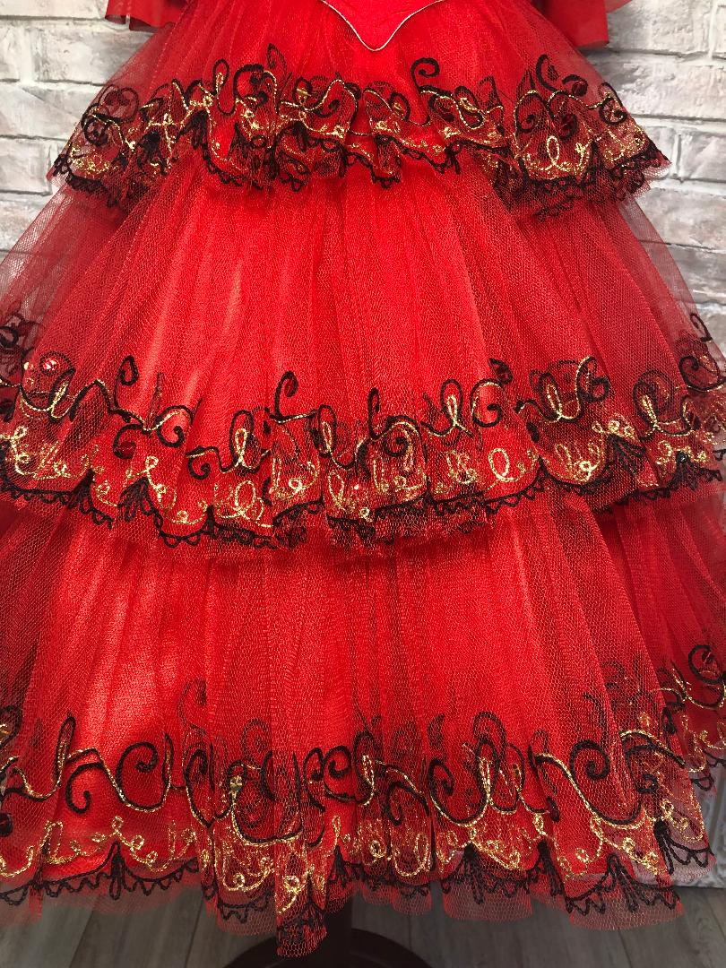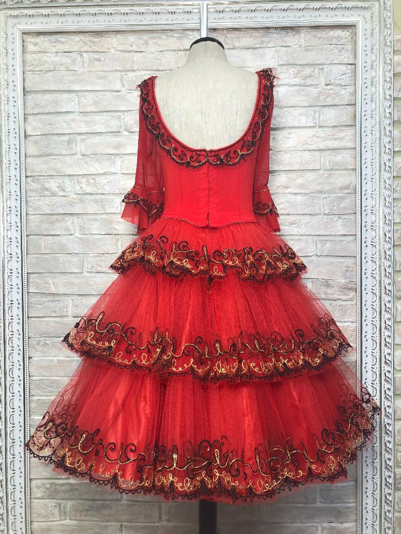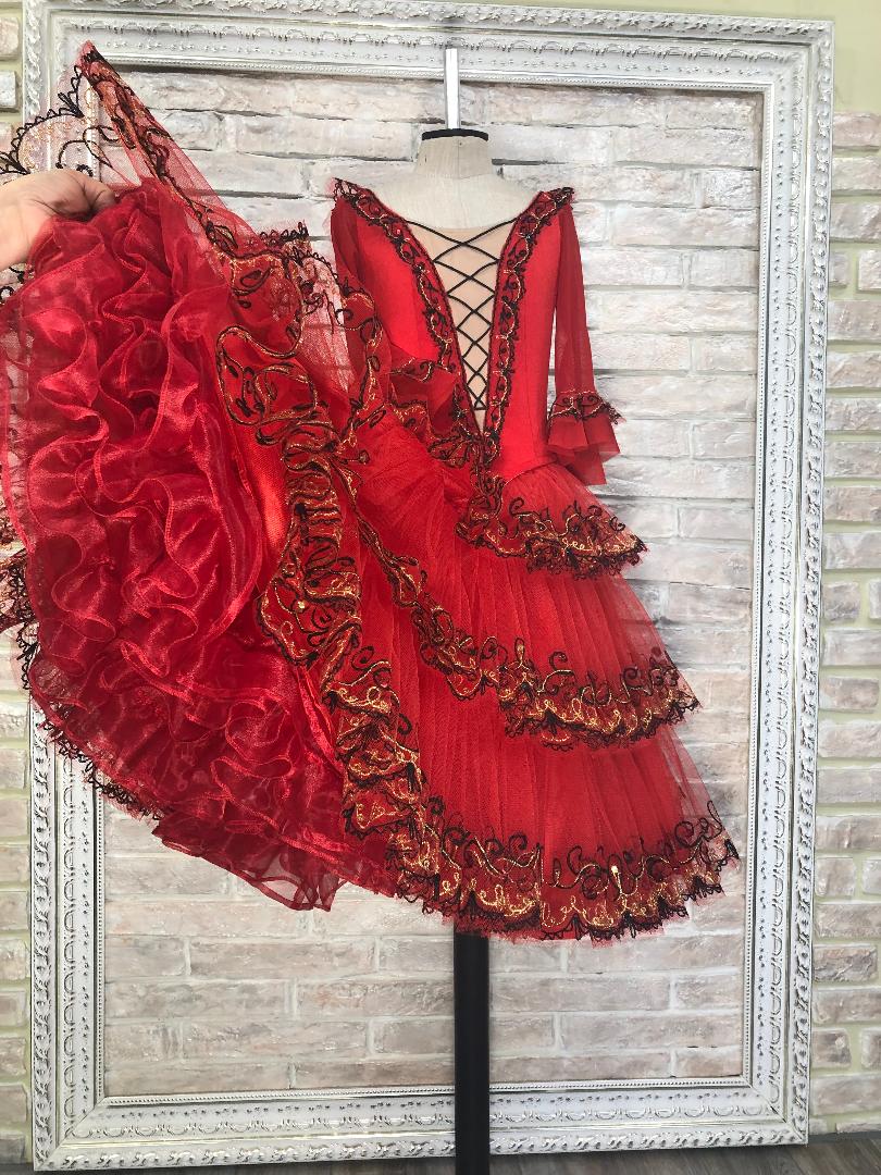 A wonderful, Russian hand made creation for the role of Kitri, in Act I. The color is a wonderful shade of deep red. The V-cut bodice can be made either in semi stretchy, high quality fabric, and features a typically Spanish crossed pattern, with nude insert, and red shiny trims. There are long, red mesh sleeves, embellished by black and r shiny trims. The red, knee length Spanish skirt, features four different levels of volants with frills and red and black lace on the edges.. The overall effect is absolutely stunning!
