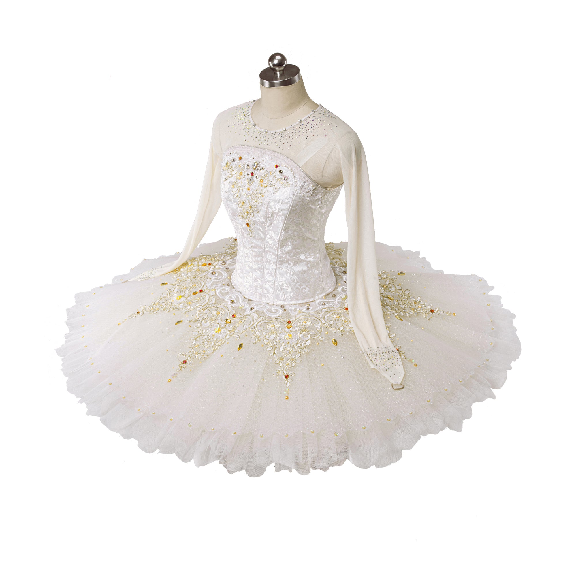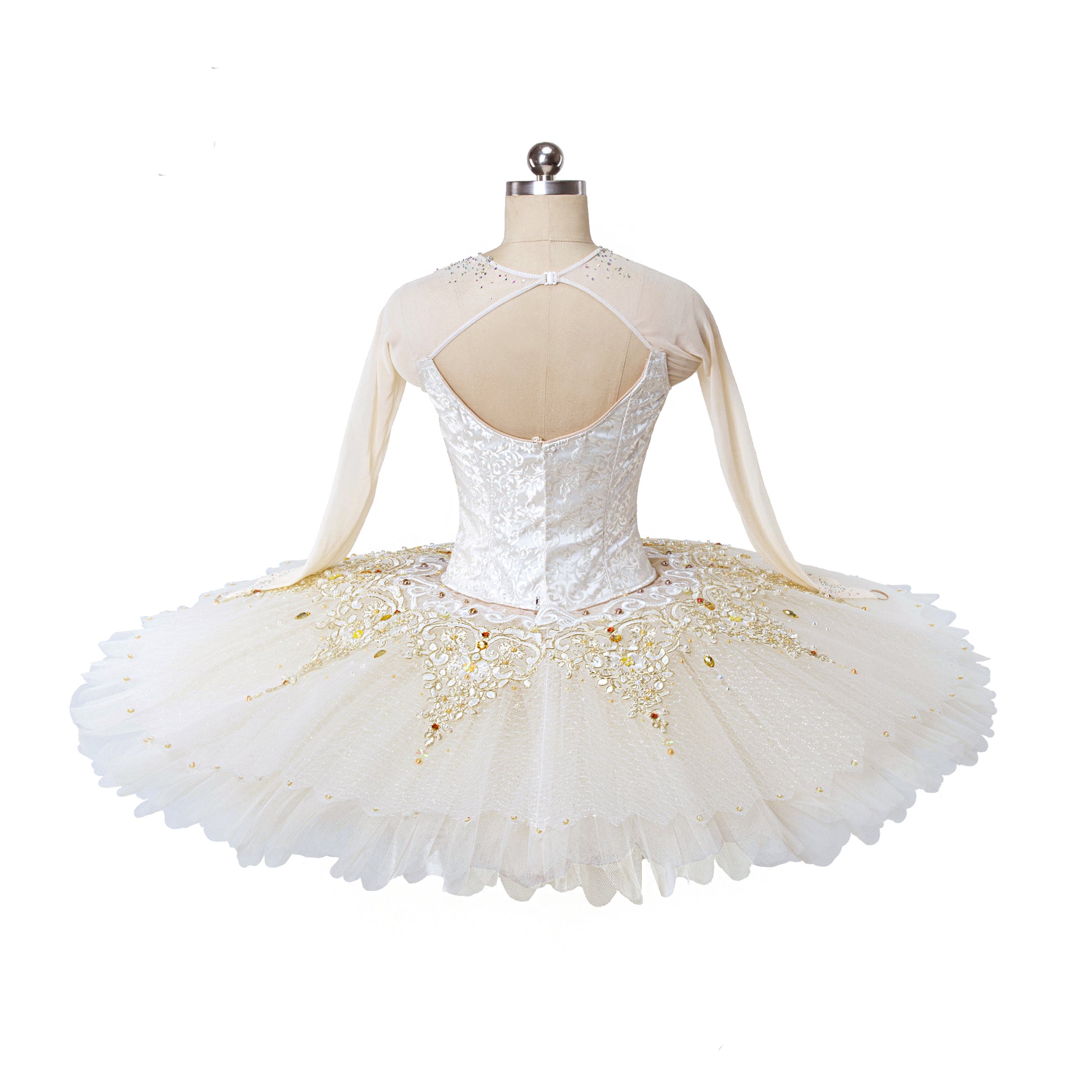 This ivory professional tutu is an exclusive creation for the most demanding ballerinas. The bodice is made with ivory brocade and richly decorated with gold appliques, crystals and white pearls. It features a mesh neckline embellished with sparkles, and long ivory, mesh sleeves.