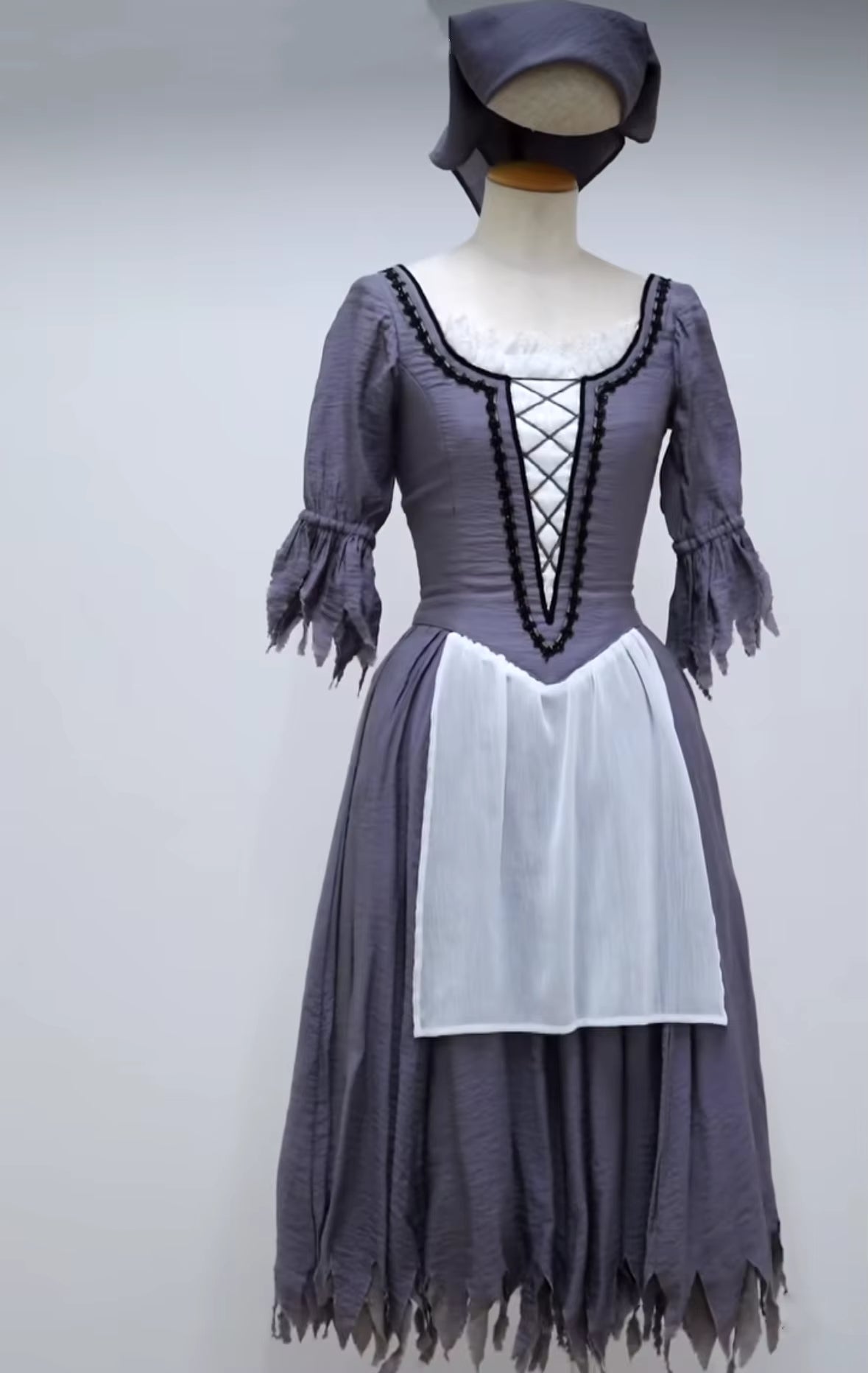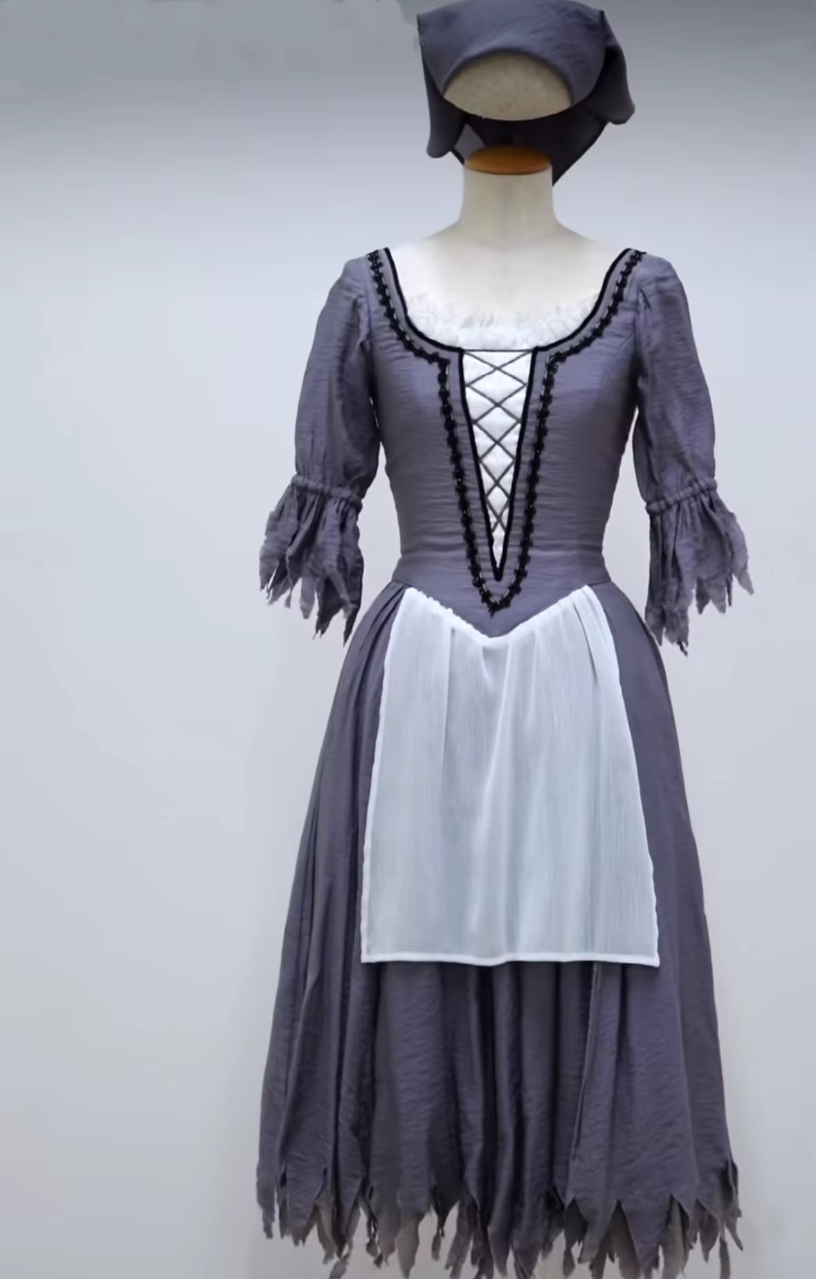 This stage costume features a V-shaped bodice with a laced pattern and a white undershirt. Round neck and three quarter sleeves with scalloped edges. The mid-calf skirt is made with high quality deep grey fabric and is decorated by a white apron. The edges of the dress are scalloped. Headpiece included.