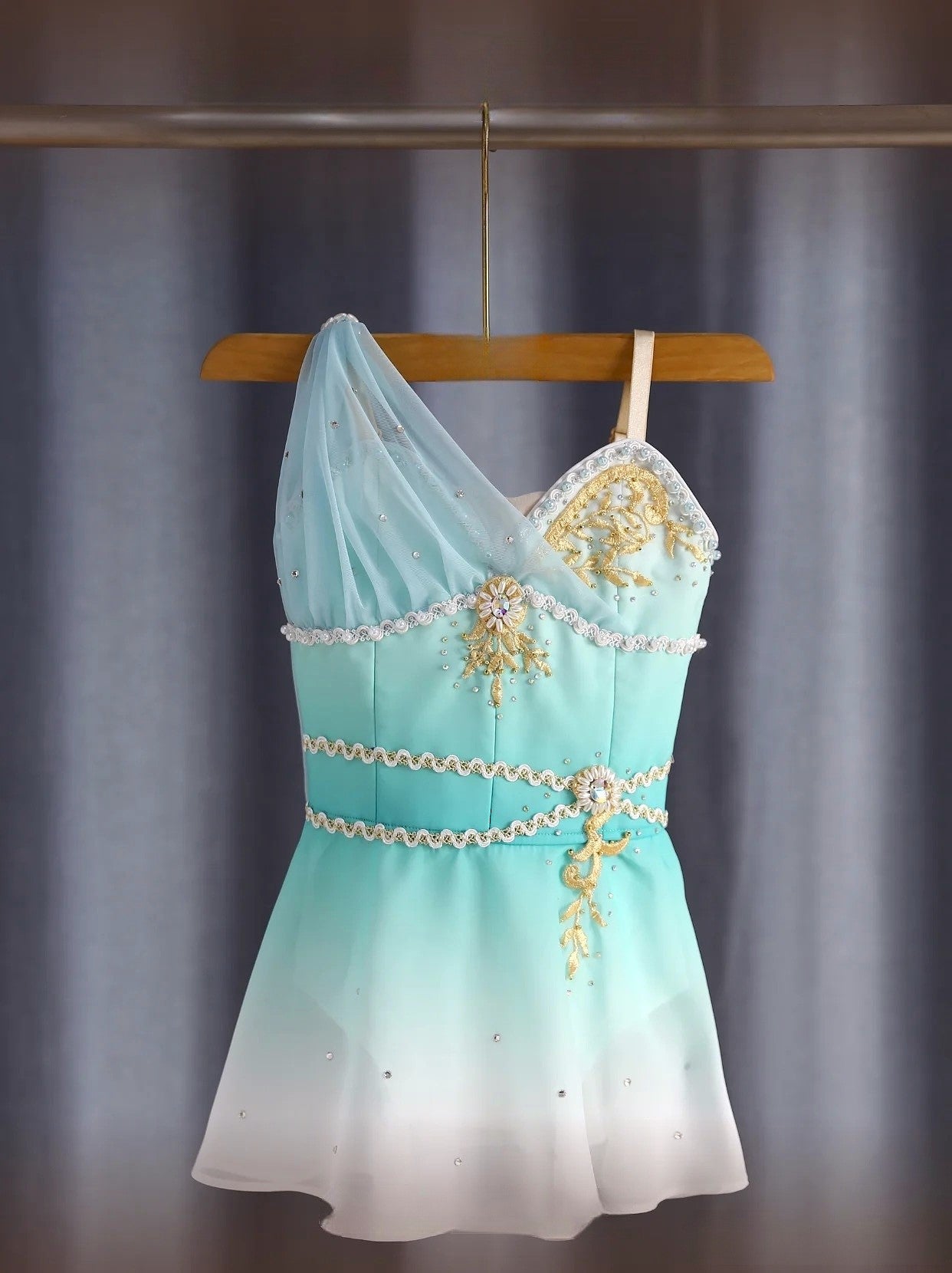 The color of this ballet costume is absolutely breathtaking. We have ombre' dyed this costume in different shades of turquoise, and the result was fantastic.