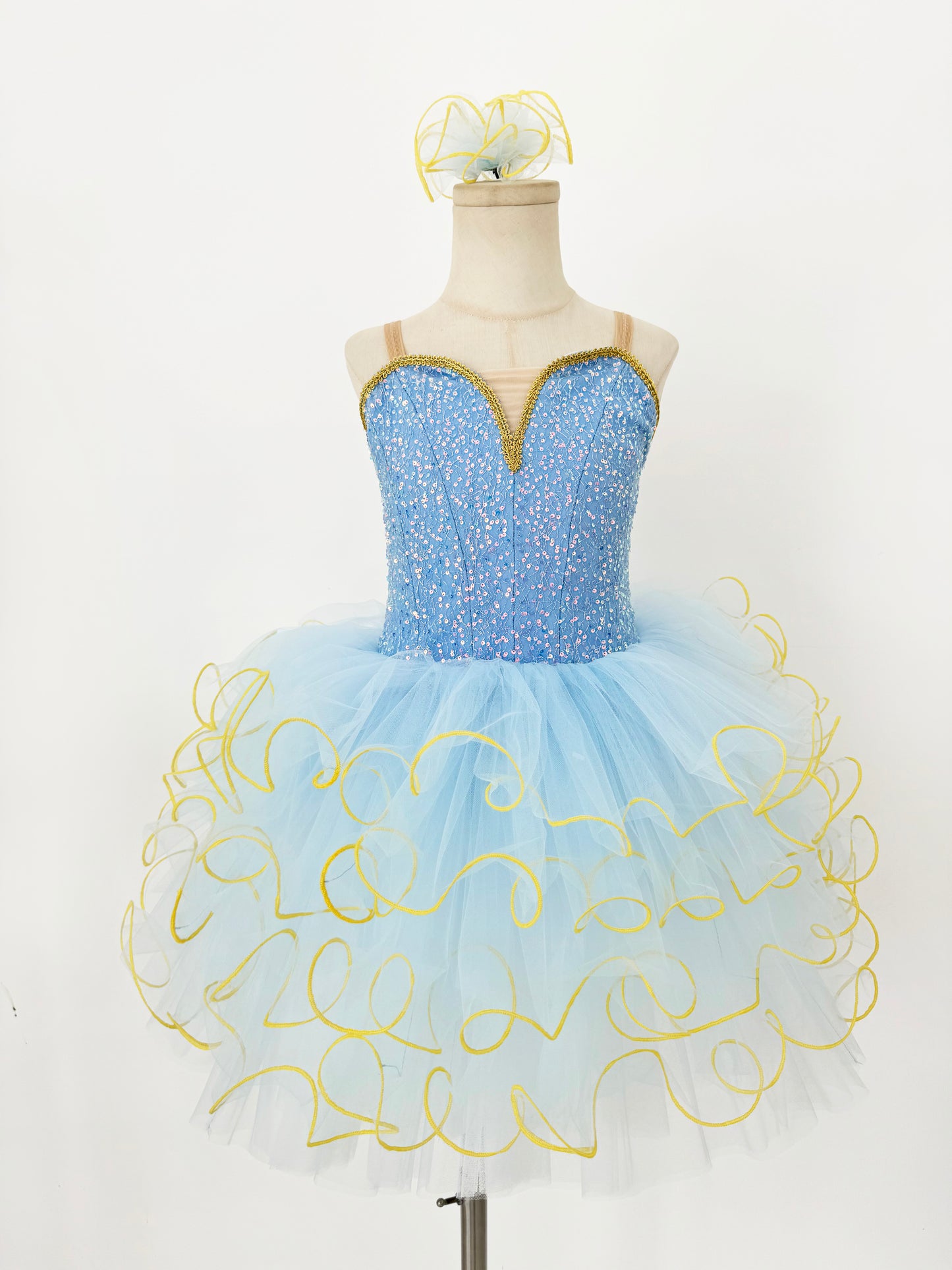 It features a pull-on, semi-stretchy sequin bodice with nude straps, a deep V cut in the front with a nude insert, and golden trims decoration. The bodice is entirely covered with golden sequins. The knee-length length tulle skirt is also decorated with golden trims and features four layers of fine tulle.. Headpiece included.