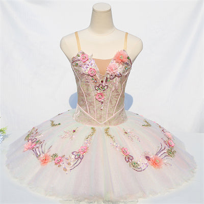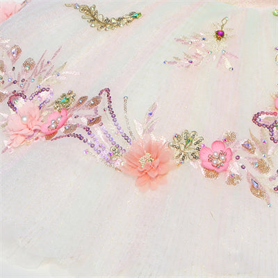 The bell shaped tutu skirt is made with ten layers of white tulle, and decorated as the bodice. Flower appliques, pearls, sequins and crystals make this tutu an amazing stage costume for high level performance.