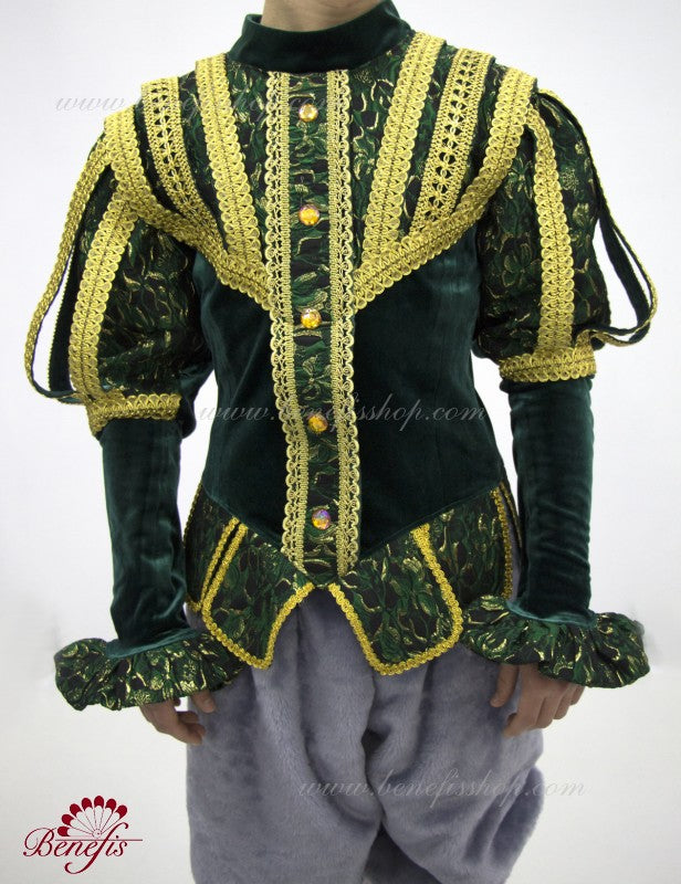 Costume details: collet, cape, breeches, gaiters and mouse had. Fabrics are rich printed brocade and semi-elastic velvet, used for the collet. The jacket is decorated with gold braids and buttons, fur fabrics, which are also used in the costume.