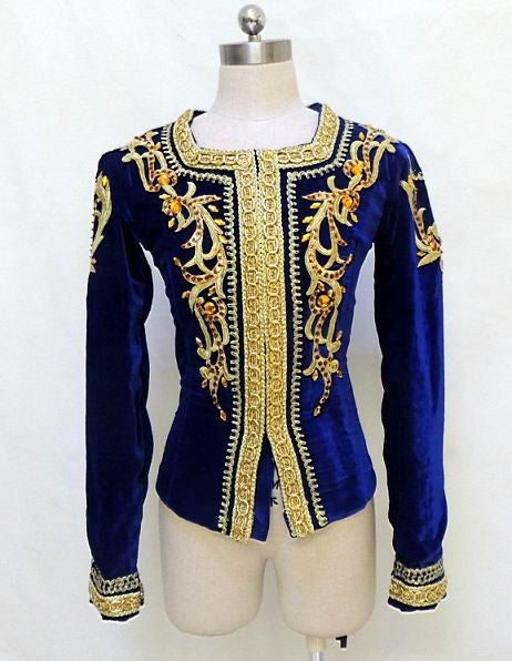 The tunic is deep dark blue and features long sleeves, a square neck and very rich decoration in gold. Embellishments include gold trims, gold appliques, gems and crystals.