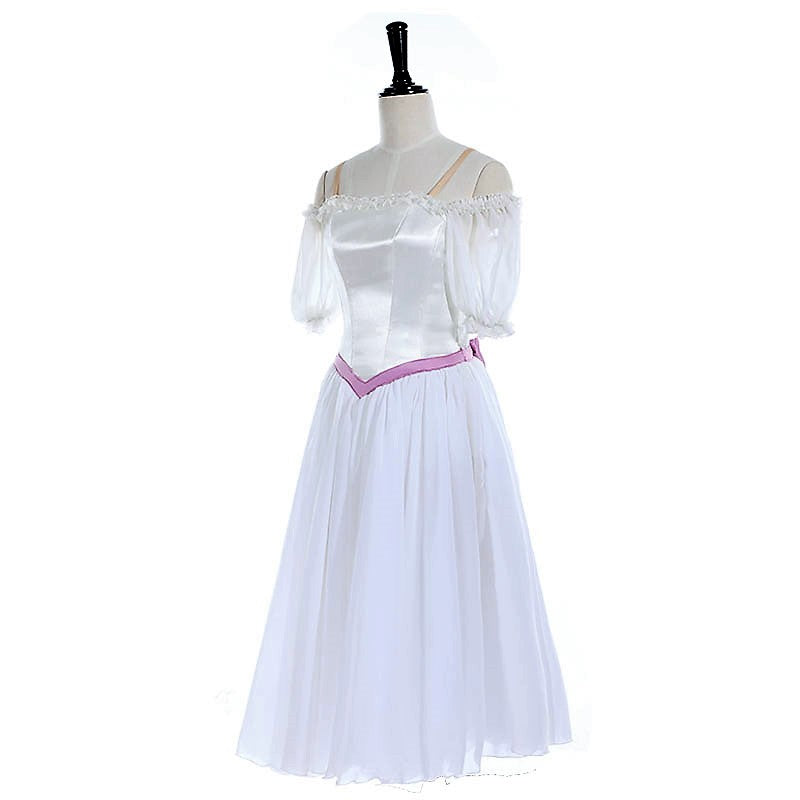 The top part is created with high quality, shiny white satin, and features a square neck with white lace decorations, and short sleeves attached to the nude straps.