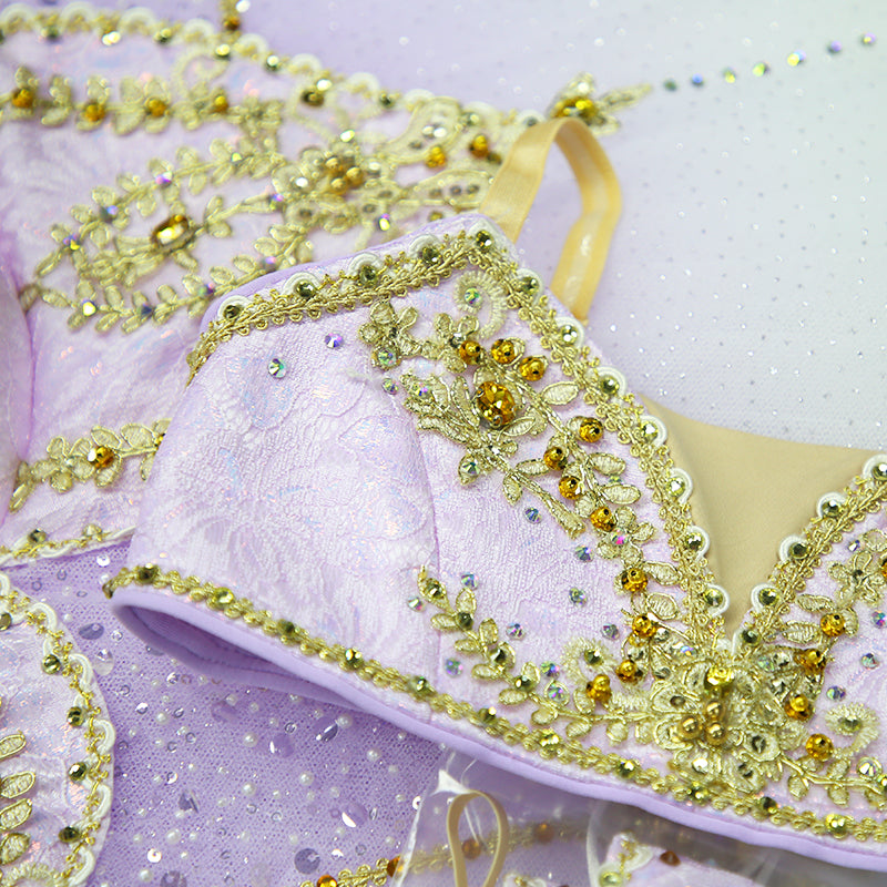 The pale lilac, platter tutu skirt features a decorated waist belt and golden decorations throughout the skirt.