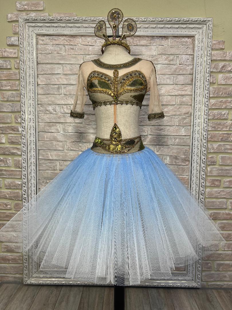 This professional costume features a short mesh top richly decorated with gold, bronze, and dark green appliques, a round neck and three quarter mesh sleeves.