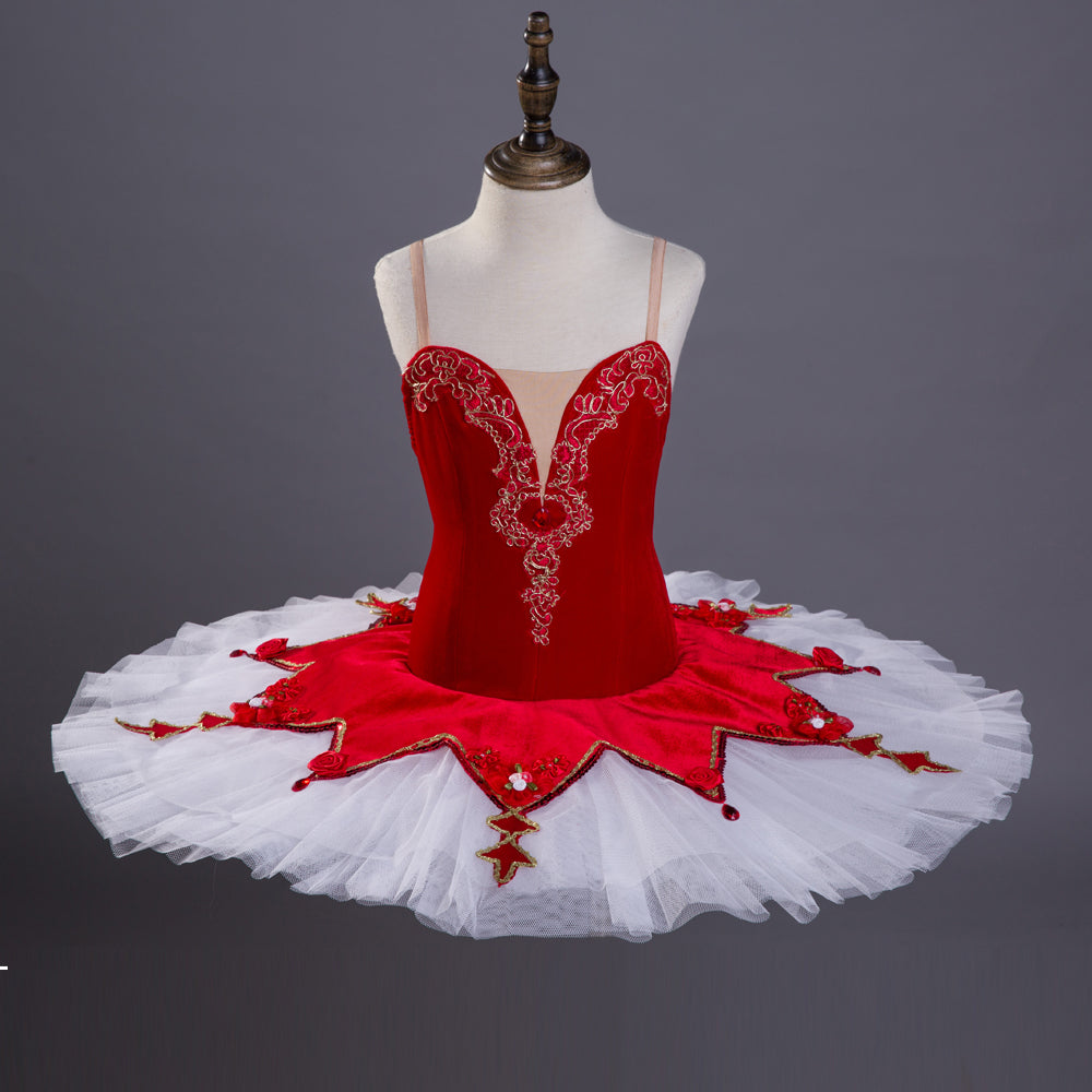 The deep v-shaped bodice of this tutu is made with deep red satin, and features a nude insert, as well as red and gold decorations.