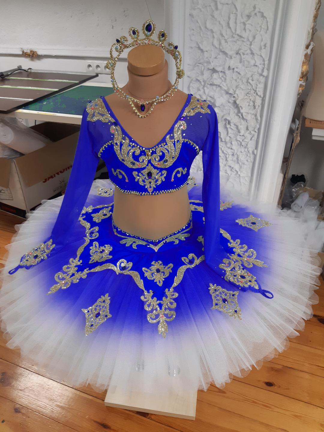 Costume made on the basis of a leotard, nude mesh on the belly, 8 layers of stiff tulle with hoop, impressive golden brocade decorations. Ombre' top layers of tulle, panties and bottom layers white, long mesh sleeves ( short sleeves upon request).
