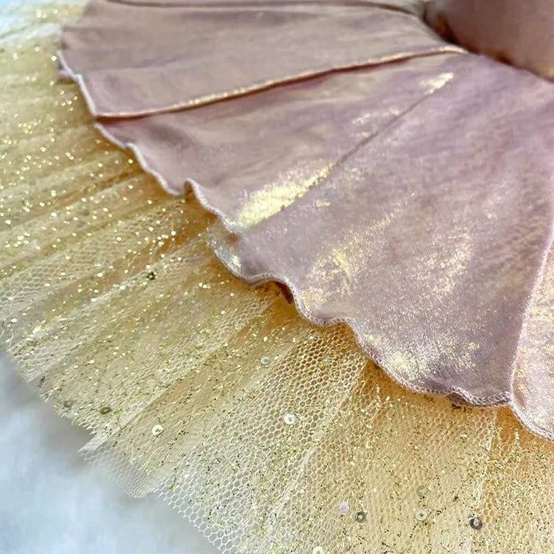 The professional pancake skirt is made according to the traditional classical style, with glittery golden tulle. The overlay is created with the same fabric used for the bodice part, and makes this tutu extremely rich.