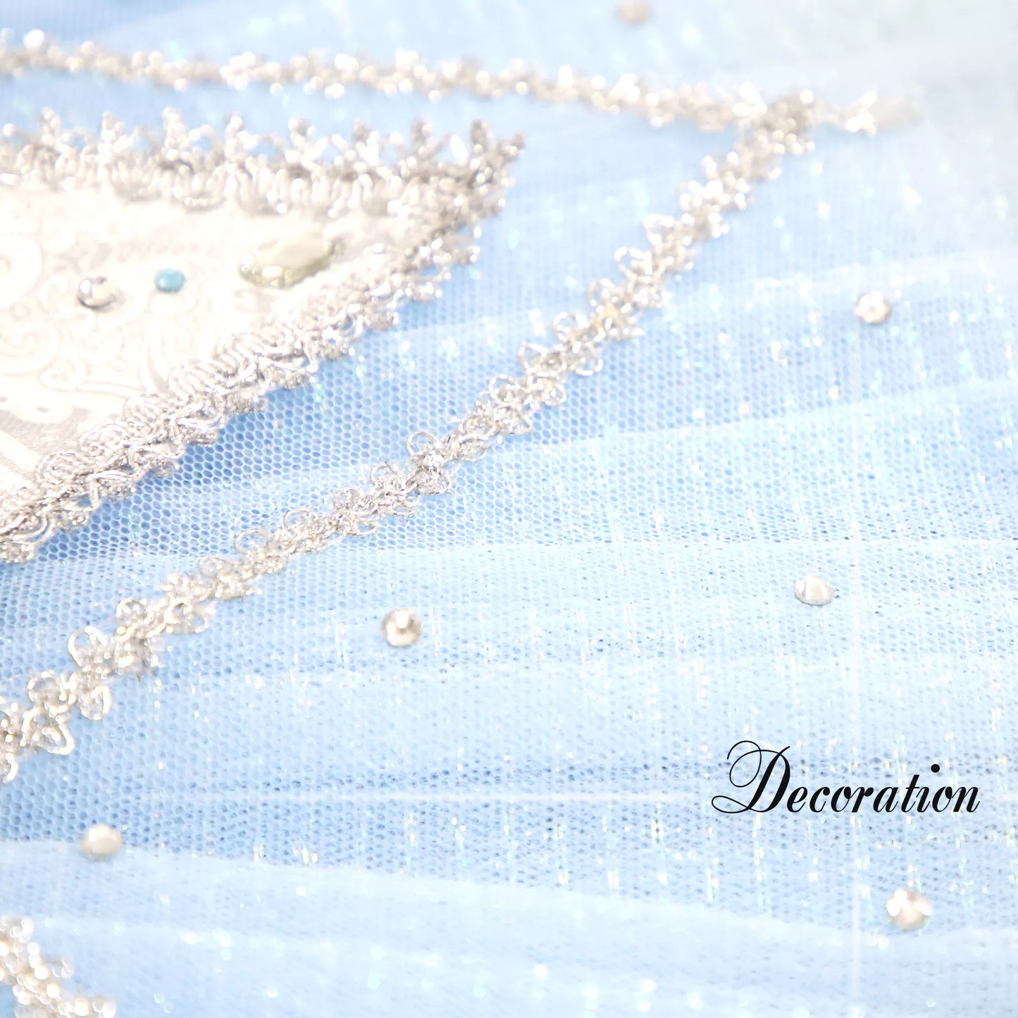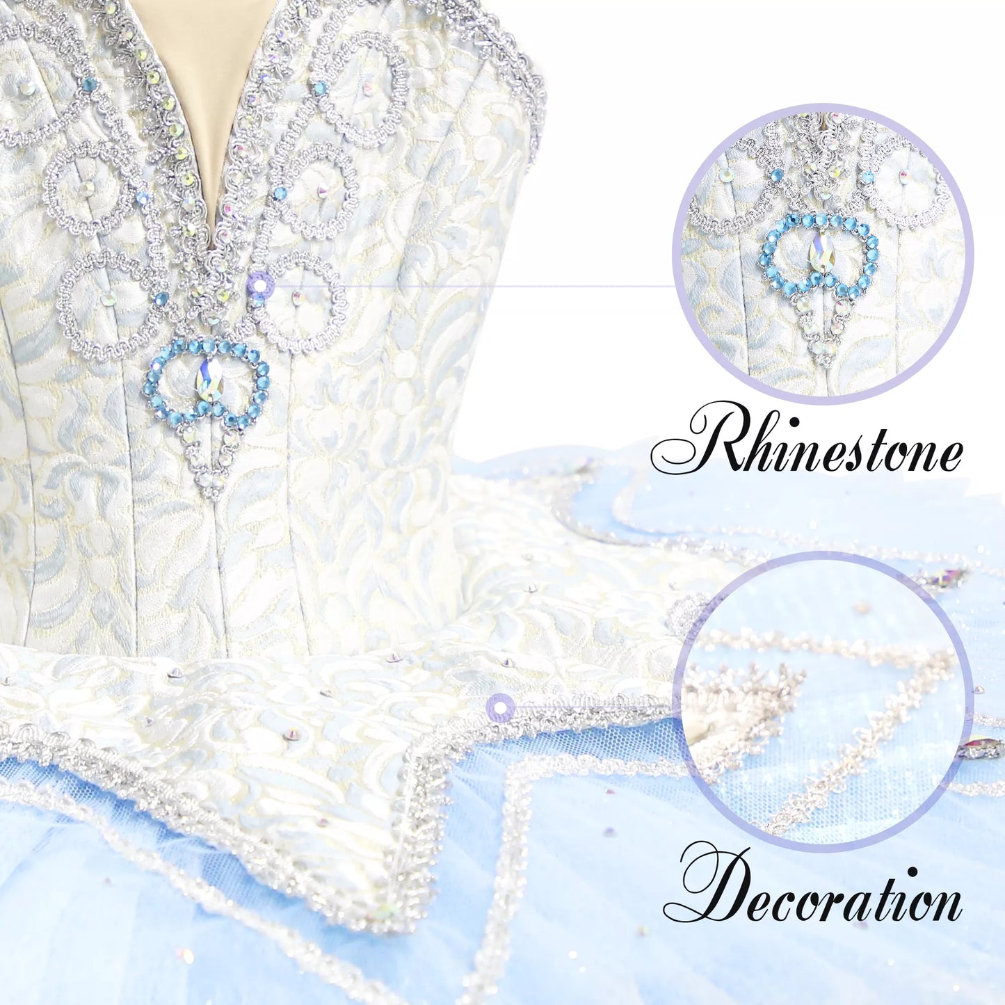 The pancake, 10 layers tutu skirt is made with pale blue tulle, and features a brocade, star shaped tutu skirt to match the bodice. The tutu skirt is also richy decorated with silver trims and sparkles.